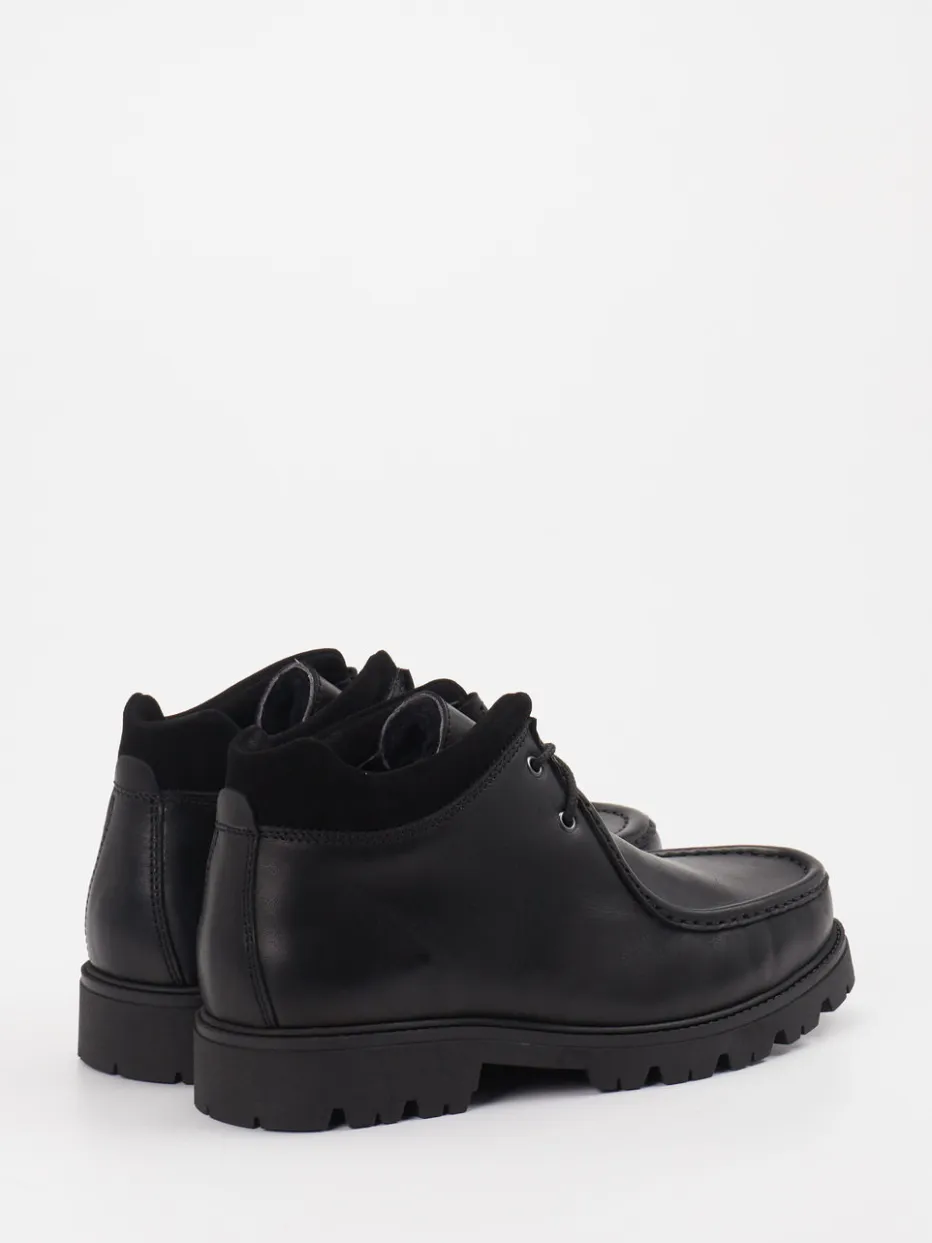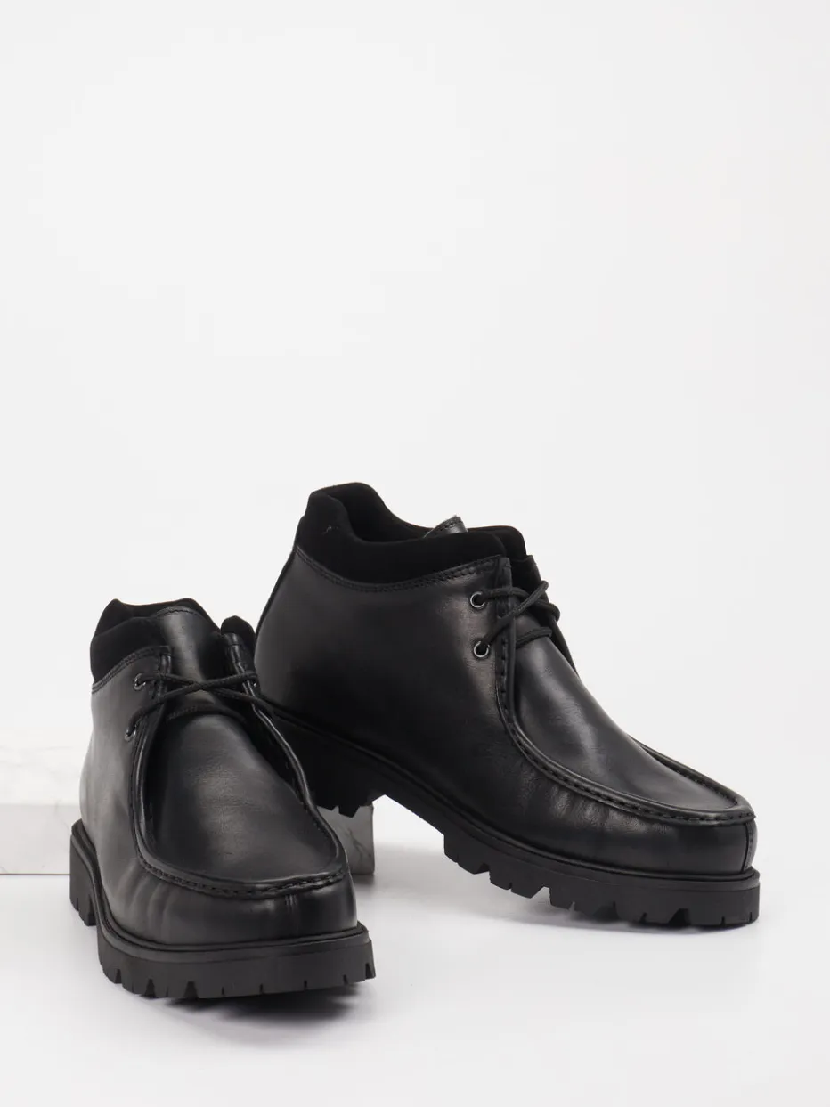 Minimalismus trifft Workwear-Charme. Ralph Harrison Country präsentiert klassische Herren-Schnürboots im Mokassin-Stil. Ideal für urbane Tage mit wechselnden Anforderungen bieten diese schwarzen Boots aus glattem Kalbleder mit samtigem Veloursbesatz am Schaft eine gelungene Verbindung aus Funktionalität und Stil. Die matte Oberfläche in tiefem Schwarz, kombiniert mit tonalen Nähten und strukturierter Profilsohle, wirkt schnörkellos und hochwertig. Der klassische Rundschnitt mit markanter Mokassin-Naht betont die zeitlose Silhouette. Ob zu Wollhose oder Jeans – die Boots passen in ein minimalistisches Workwear-Styling. Ein robust-eleganter Begleiter mit dezenter Quiet-Luxury-Aura für anspruchsvolle Tagespläne.