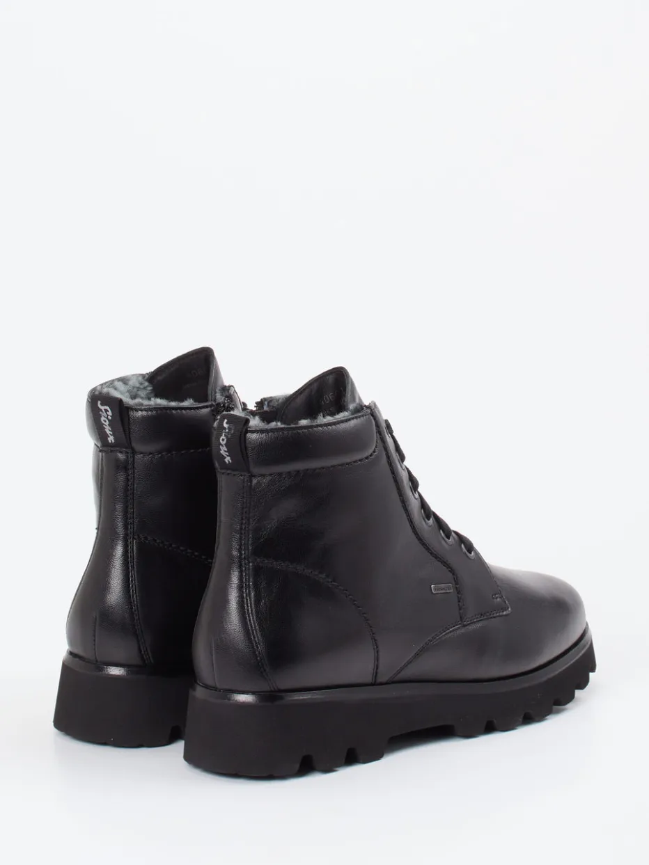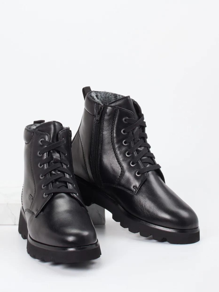 Wetterfest durch die kalte Jahreszeit.Die Marke Sioux präsentiert hier komfortable Schnürboots für Damen. Ob im Stadtalltag oder bei Spaziergängen im Winter – diese wind- und wasserdichten Boots aus handschuhweichem Kalbleder schützen zuverlässig vor Kälte und Nässe. Das glänzende Obermaterial in klassischem Schwarz wird ergänzt durch ein warmes Innenfutter aus Lammfell. Die knöchelhohe, rund zulaufende Form bietet bequemen Halt, während Reißverschluss und Schnürung den Einstieg erleichtern. Eine griffig profilierte Gummisohle sorgt für Trittsicherheit auch auf rutschigem Untergrund. Dezente Ton-in-Ton-Nähte und ein seitliches Markenbadge runden das Design ab. Stilbewusste Funktionalität mit hohem Tragekomfort – typisch Sioux.