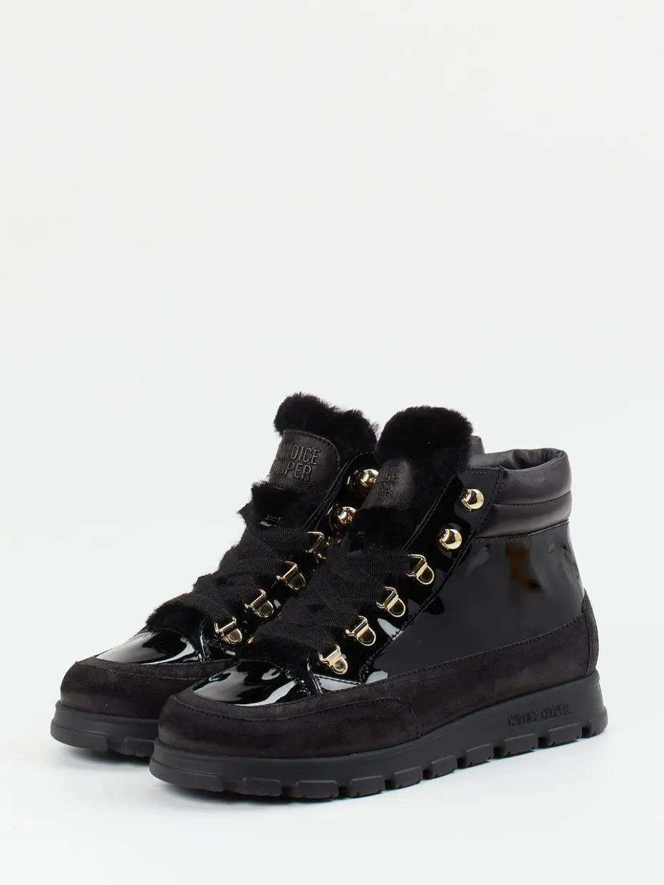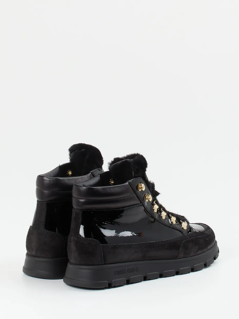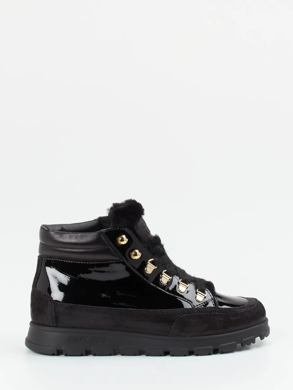 Glanzmomente für kalte Tage.Candice Cooper präsentiert stilvolle Damen-Schnürboots für den Winter. Ein urbaner Look trifft bei diesem Modell auf funktionale Wärme und Eleganz. Glänzendes schwarzes Lackleder vereint sich mit samtig-weichen Veloursdetails und einer markanten goldfarbenen Schnürung. Die knöchelhohe Silhouette mit Kalblederfutter und gepolsterter Gummisohle sorgt für Komfort selbst bei frostigen Temperaturen. Die profilierte Sohle mit starkem Grip sowie die warme Fütterung und gefütterte Zunge machen den Schuh outdoor-tauglich. Klare Linien und Ton-in-Ton-Schnürung unterstreichen den minimalistischen Charakter – passend zu Steppjacke und Kaschmir-Mütze. Ein markenspezifischer Stil mit funktionalem Anspruch für entspannte Wintertage.