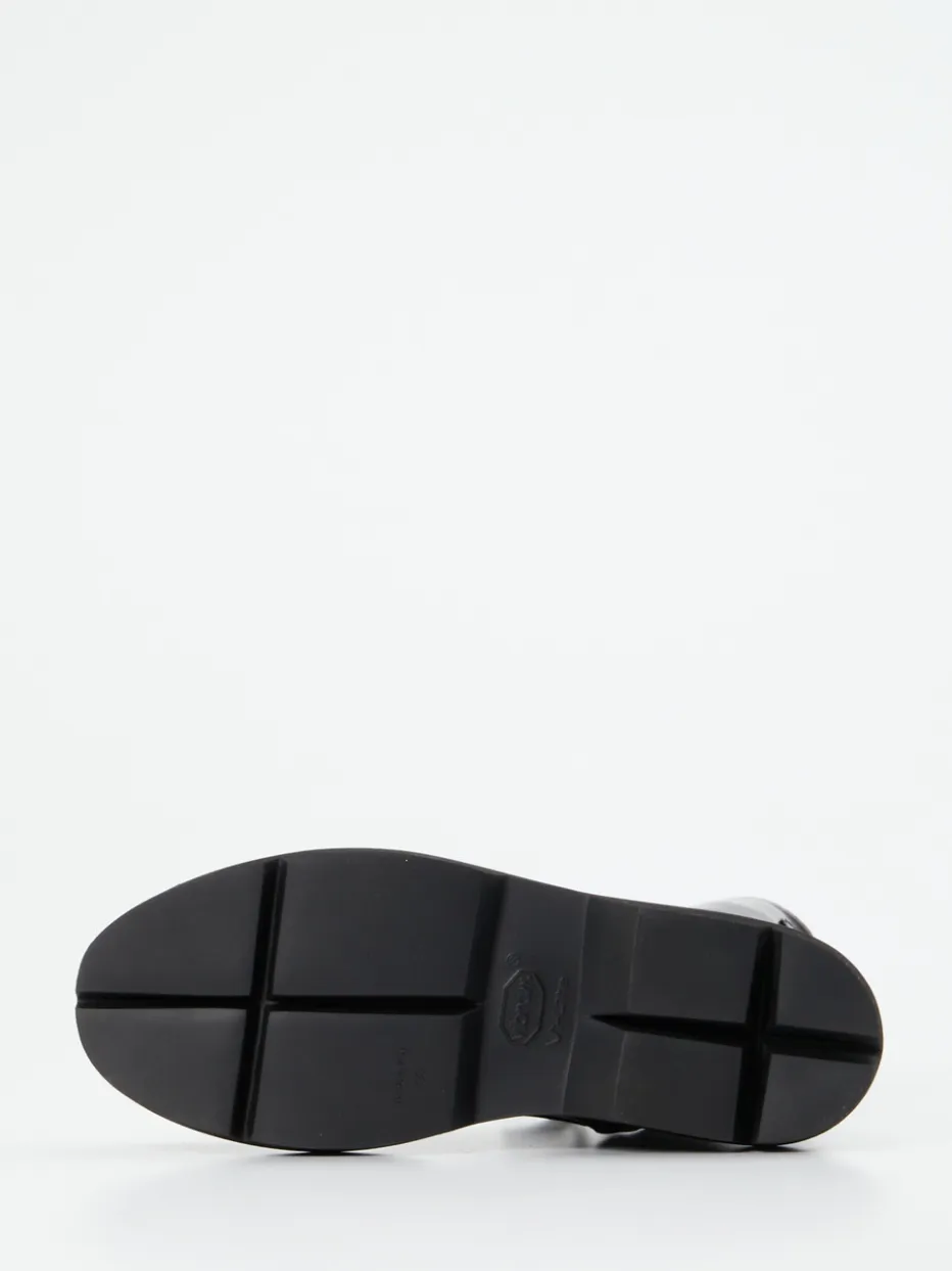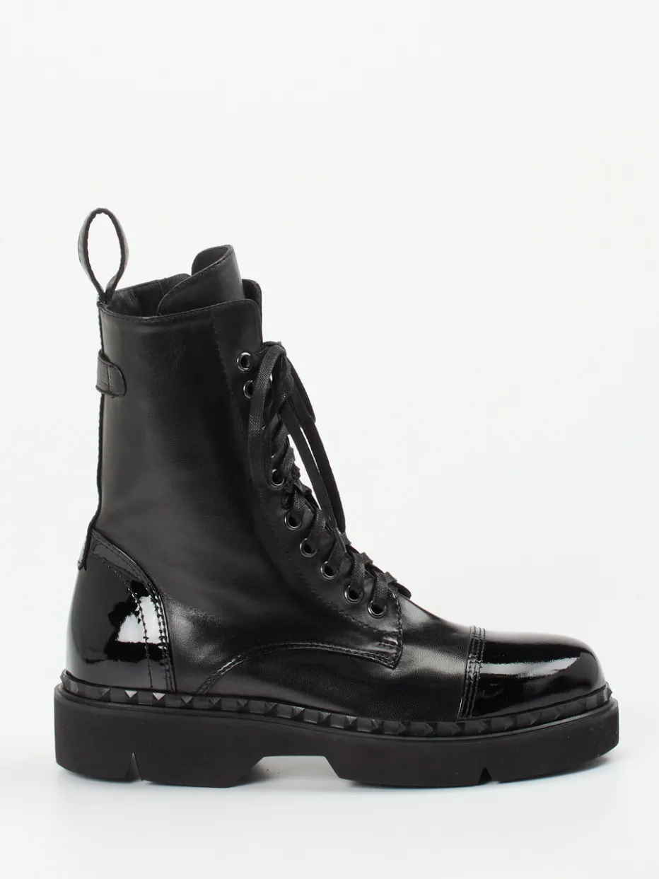 Ideal für urbane Styles mit Selbstbewusstsein: Der hohe Schaft kann sowohl in edgy Freizeit-Looks als auch am Abend überzeugen. Das schwarze Lammleder trifft auf glänzende Partien aus Lackleder an Kappe und Ferse, ergänzt durch markante Ziernieten entlang der profilierten Vibram-Gummisohle. Schnürung und seitlicher Reißverschluss garantieren Komfort, während die Combat-inspirierte Silhouette stilistisch am Puls der Zeit bleibt. Ein cleanes Kombitalent – besonders gut zu Bikerjacke und Lederaccessoires.