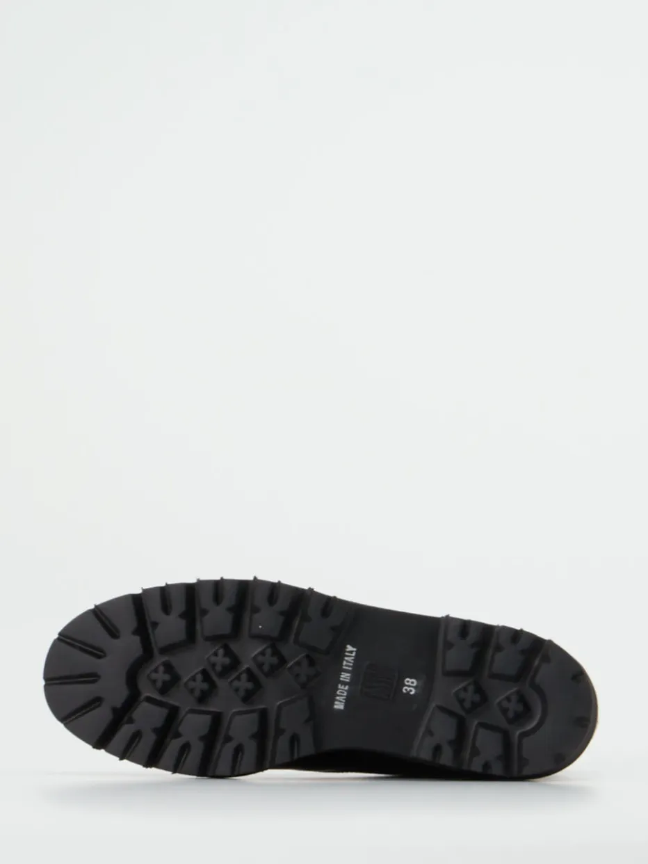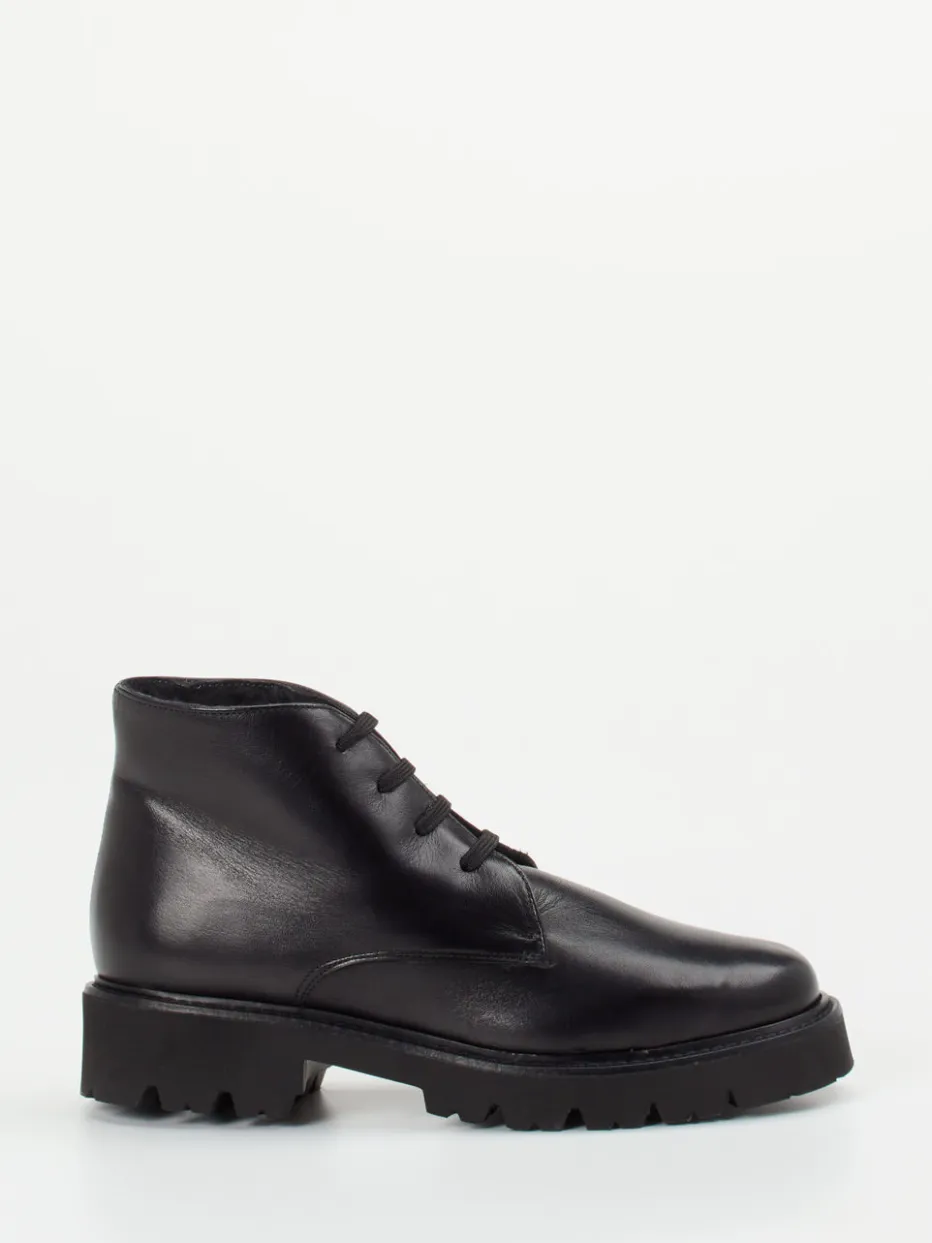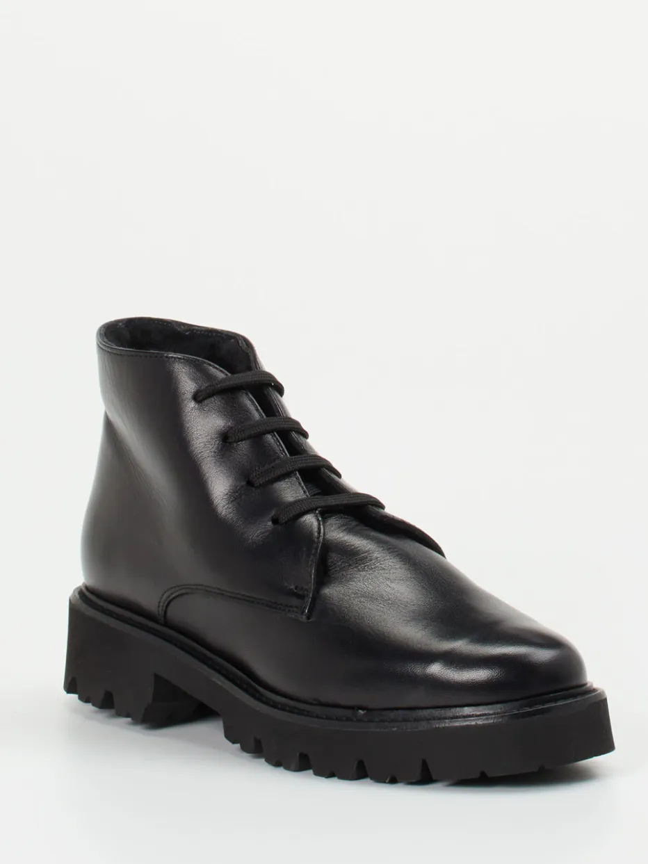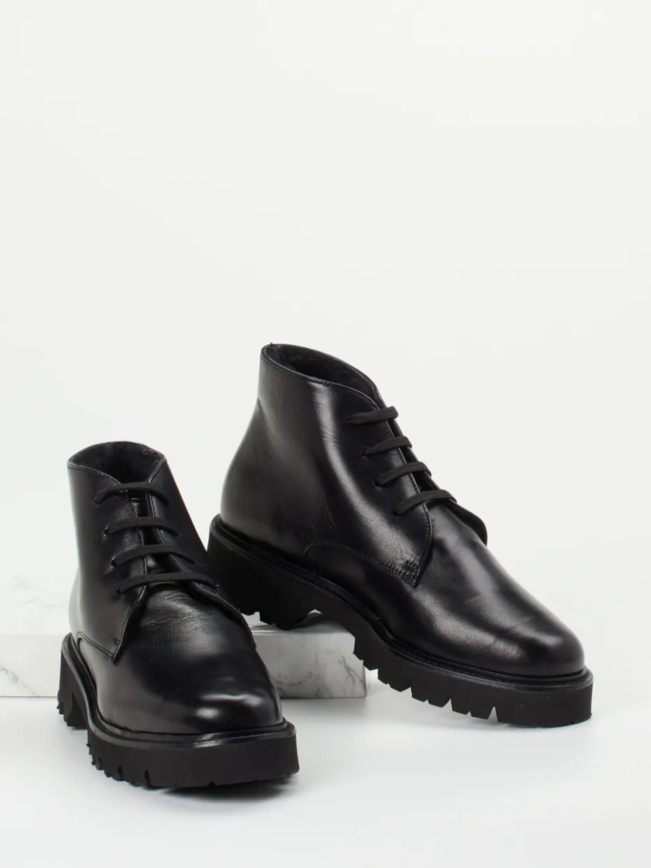 Komfort trifft auf urbanen Minimalismus.Mannori präsentiert mit diesen Schnürboots eine stilvoll robuste Lösung für Alltag und Büro. Das schwarze Lammleder wirkt durch seine glatte, dezent glänzende Oberfläche besonders edel und wird von Ton-in-Ton-Ziernähten durchzogen. Die klassisch-robuste Silhouette mit kräftiger Chunky-Sohle greift aktuelle Trends wie „Quiet Luxury“ und „Utility“ auf. Dank Lammfellfutter und gepolstertem Lederfußbett entsteht ein komfortables Tragegefühl auch an kalten Tagen. Die profilierte Gummisohle sorgt für Trittsicherheit. Ideal zu schwarzem Wollmantel oder minimalistischer Lederhandtasche. Ein moderner Schuh mit Handwerk und Funktion im Fokus.