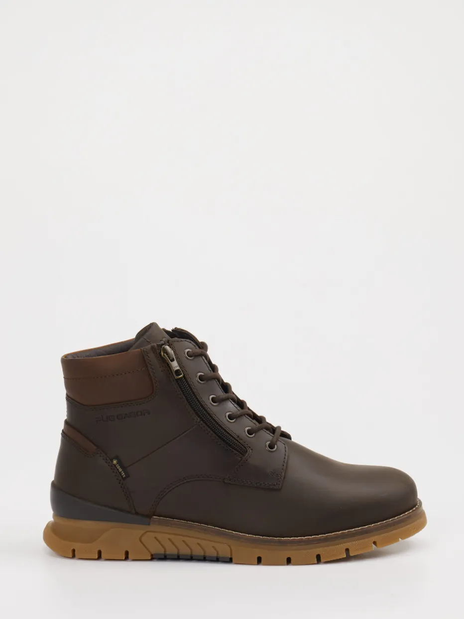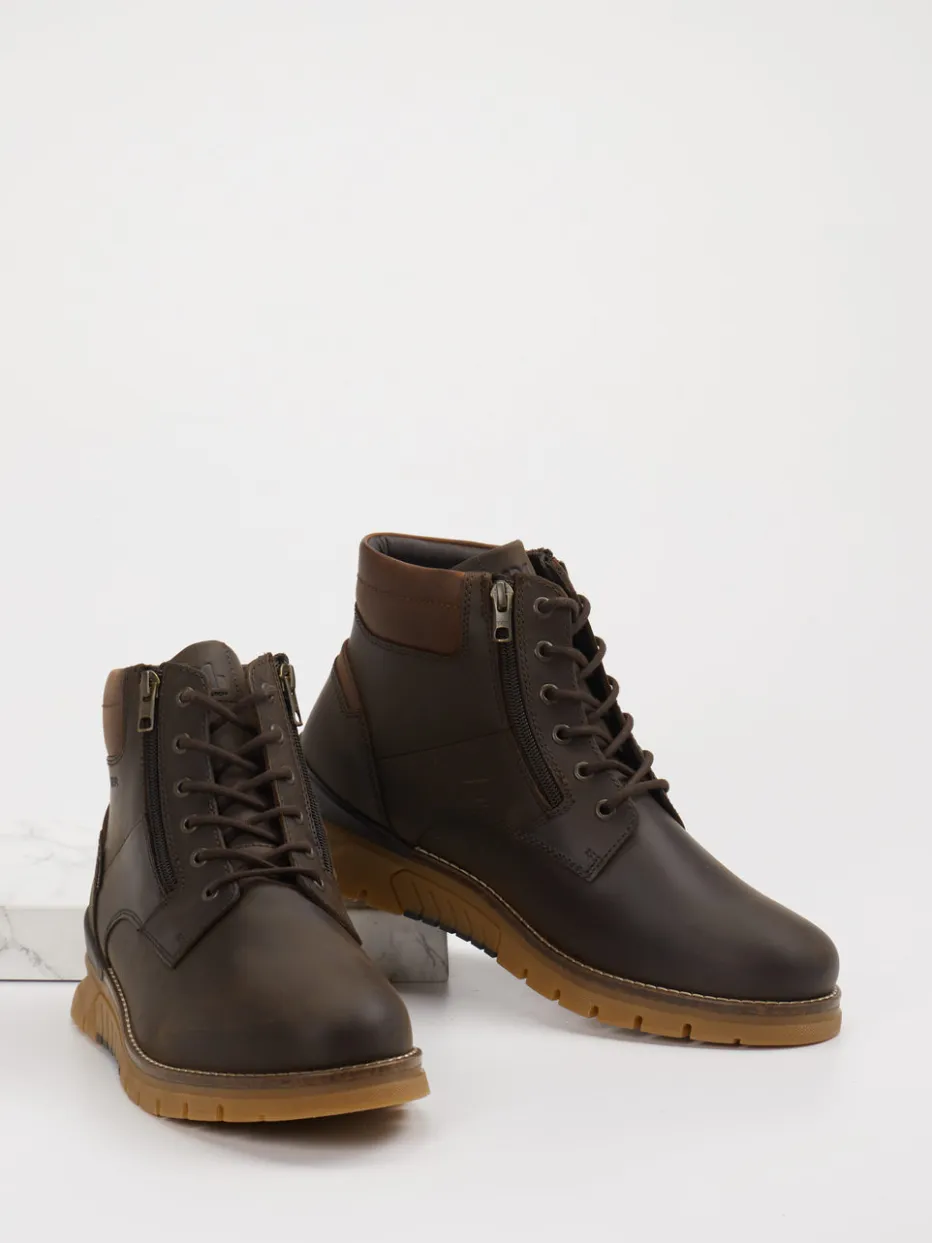 Vielseitigkeit für Stadt und Natur. Pius Gabor präsentiert robuste Herren-Schnürboots mit wetterfestem Obermaterial. Das glatte, matte Leder in dunklem Braun unterstreicht den funktionalen Charakter dieses Modells. Mit einer klassischen, knöchelhohen Silhouette, seitlichem Reißverschluss und markanter Profilsohle verbinden die Boots alltagstauglichen Komfort mit Streetwear- und Utility-Einflüssen. Ton-in-Ton-Nähte, altmessingfarbene Metallzipper und eine zweifarbige Laufsohle setzen dezente Akzente. Ob bei Herbstspaziergängen oder im urbanen Alltag – dieser Freizeitschuh passt zu Casual-Looks ebenso wie zu wetterfester Outdoorkleidung. Zuverlässiger Stil mit Komfortanspruch – typisch Pius Gabor.