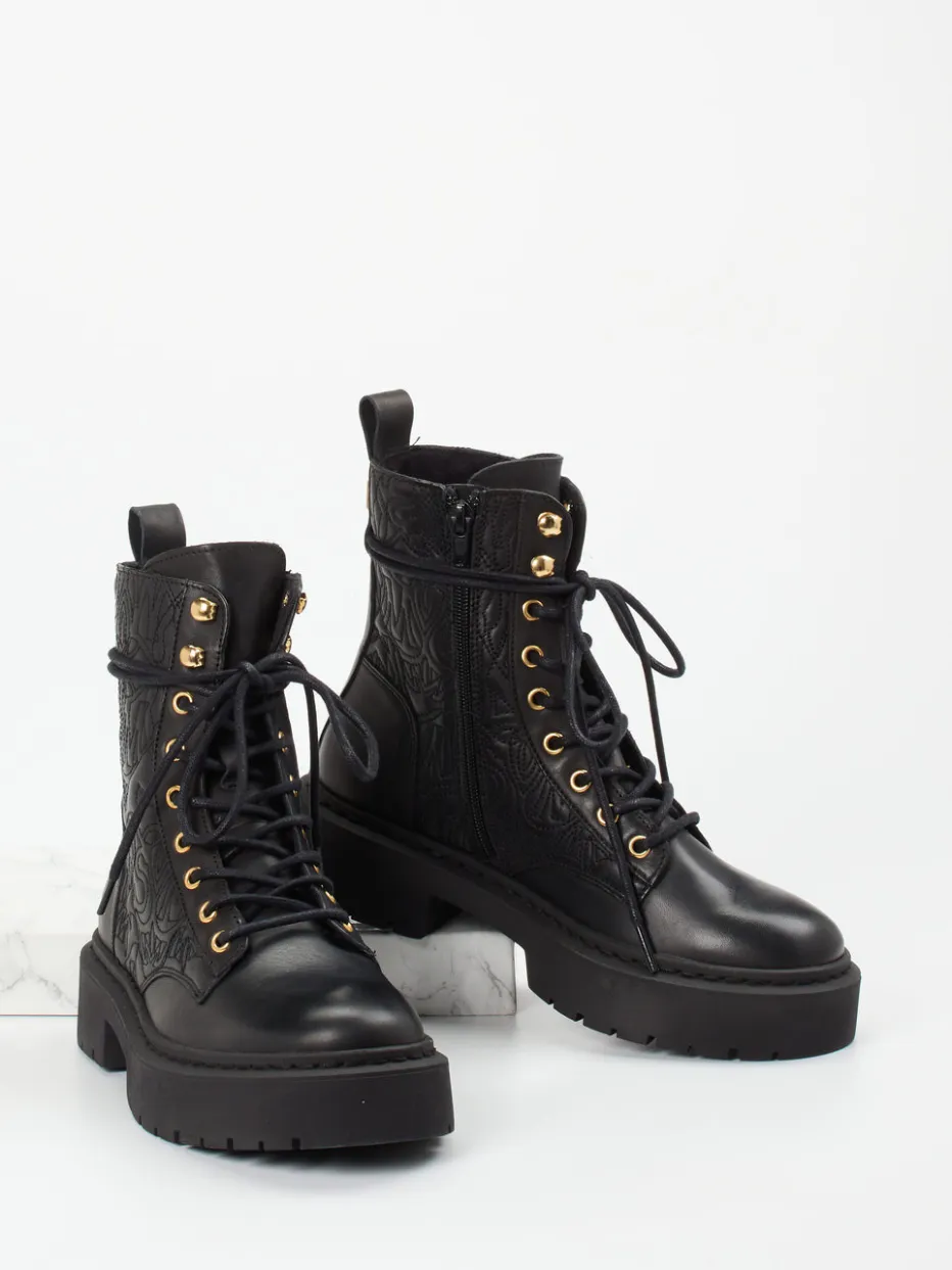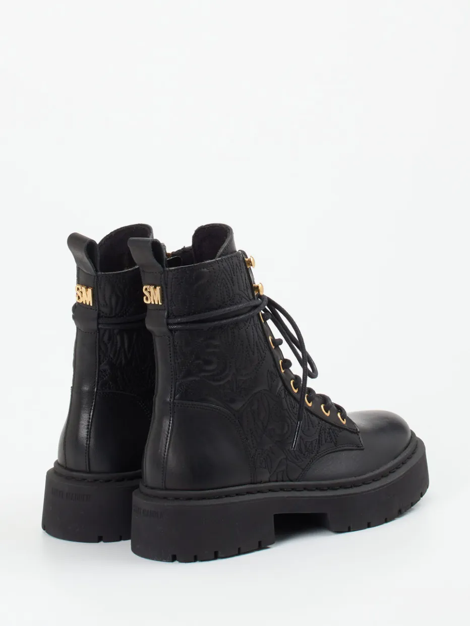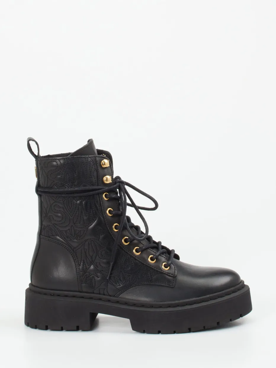 Diese Schnürboots von Steve Madden kombinieren robustes Leder mit goldfarbener Hardware und einem geprägten Monogramm – ein selbstbewusstes Statement im Streetstyle.
