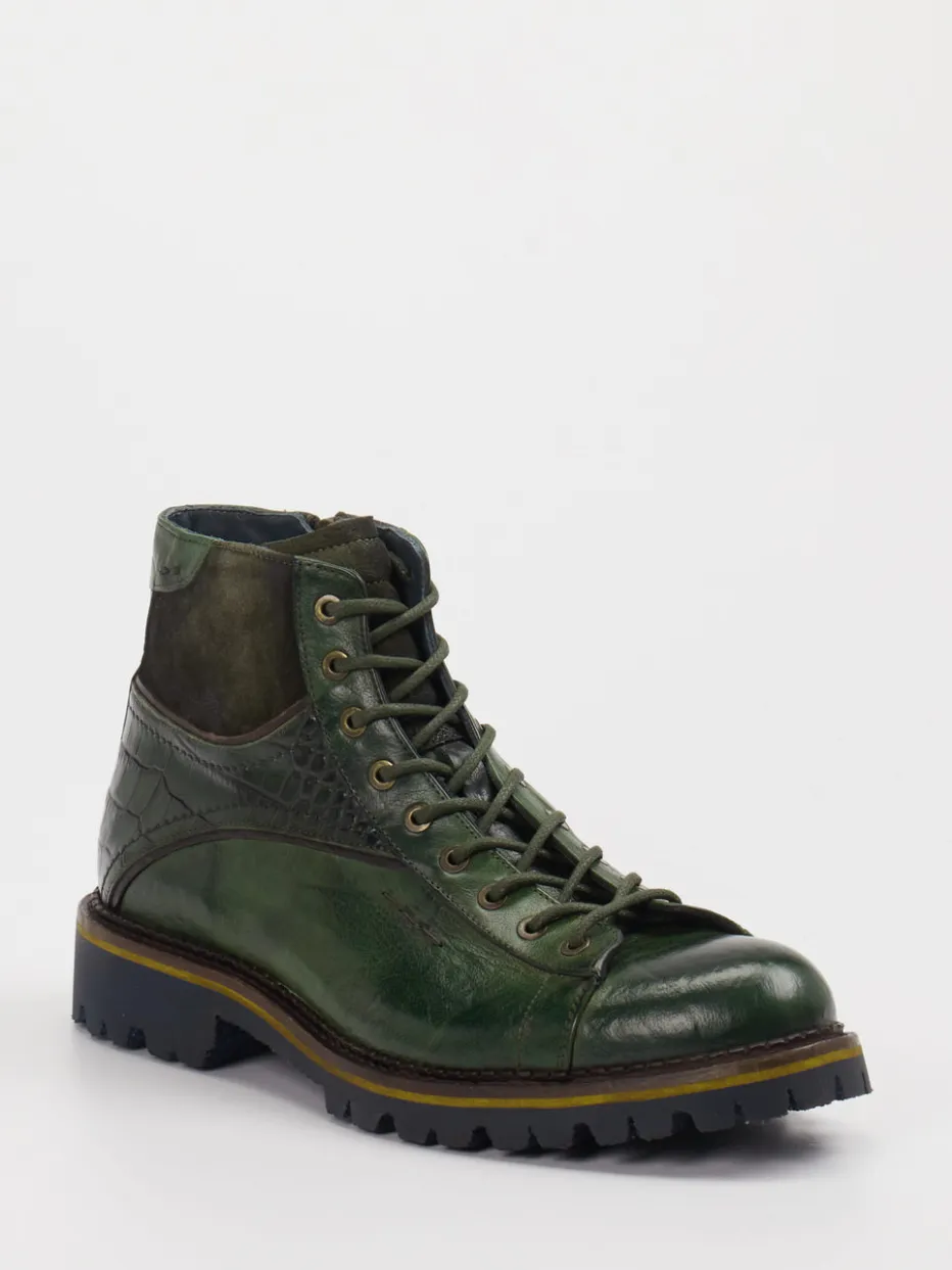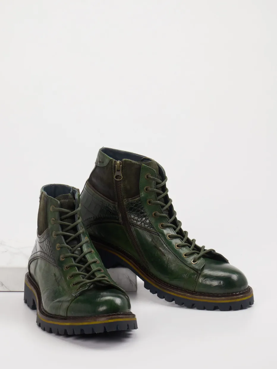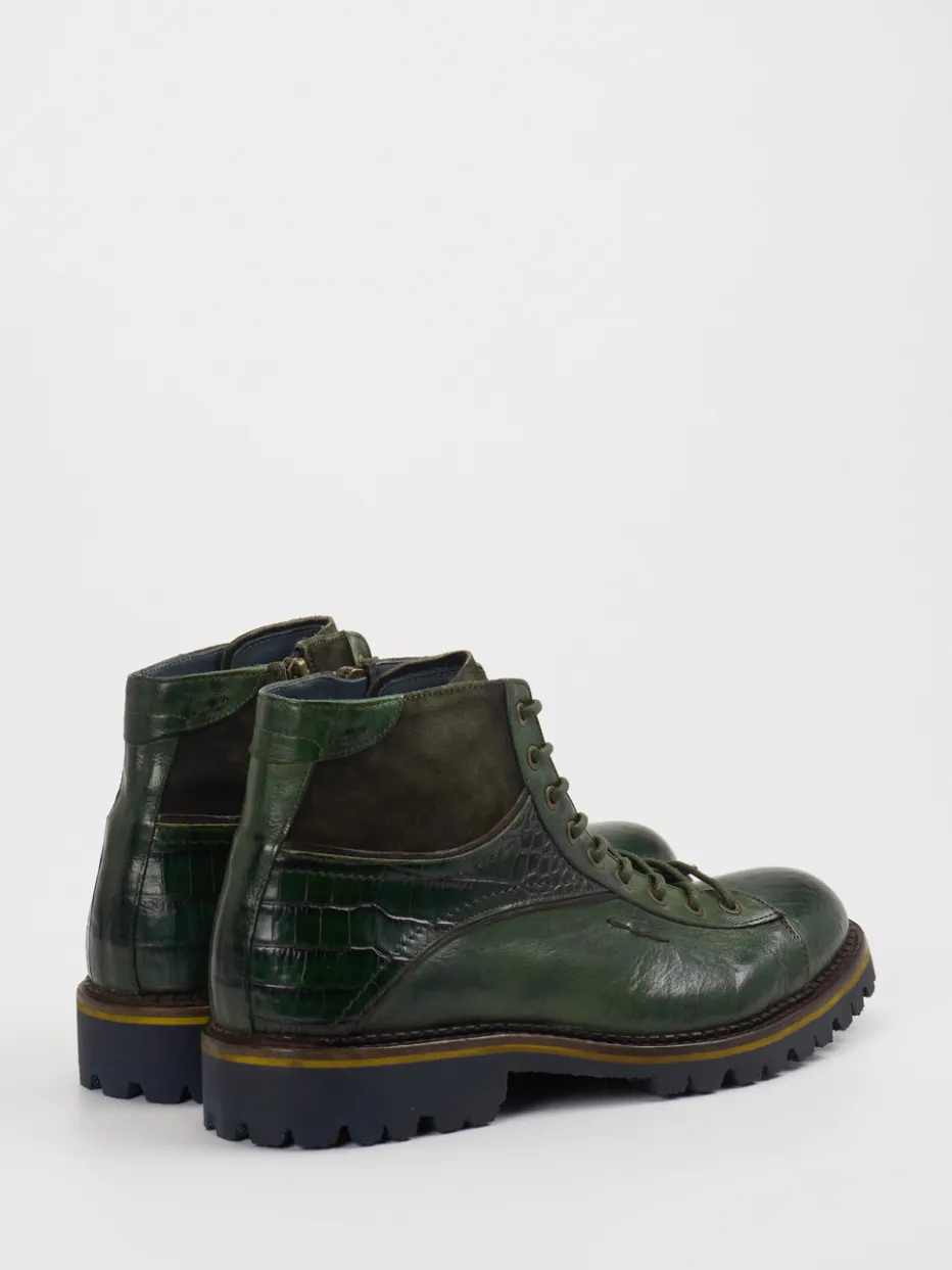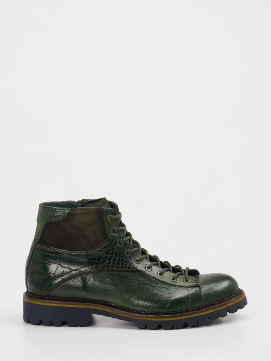 Strukturreiche Boots für maskuline Herbst-Looks. Konstantin Starke interpretiert klassische Schnürboots für Herren mit modischem Anspruch neu. Die Kombination aus glattem Kalbleder und Veloursleder-Anteilen mit Kroko-Prägung in kräftigem Waldgrün trifft den aktuellen Textur-Mix-Trend. Der seitliche Reißverschluss ergänzt die Schnürung funktional, während die robuste Profilsohle und der gelbe Kontraststreifen markante Akzente setzen. Ideal für Freizeit, Stadt oder Outdoor inspiriert – besonders angesagt bei einem jungen, ausdrucksstarken Stilverständnis. Ein stilsicherer Begleiter mit expressivem Designanspruch – typisch Konstantin Starke.