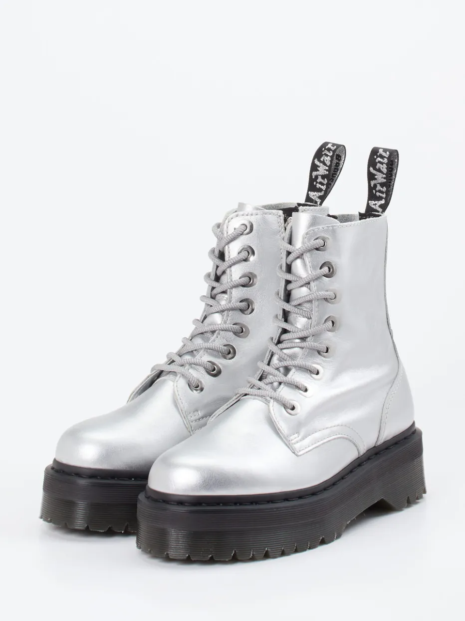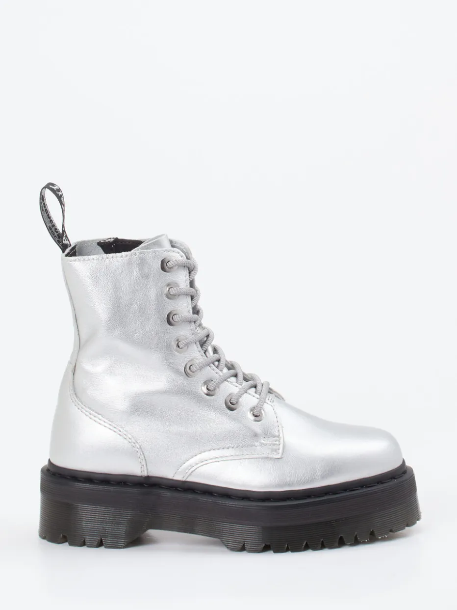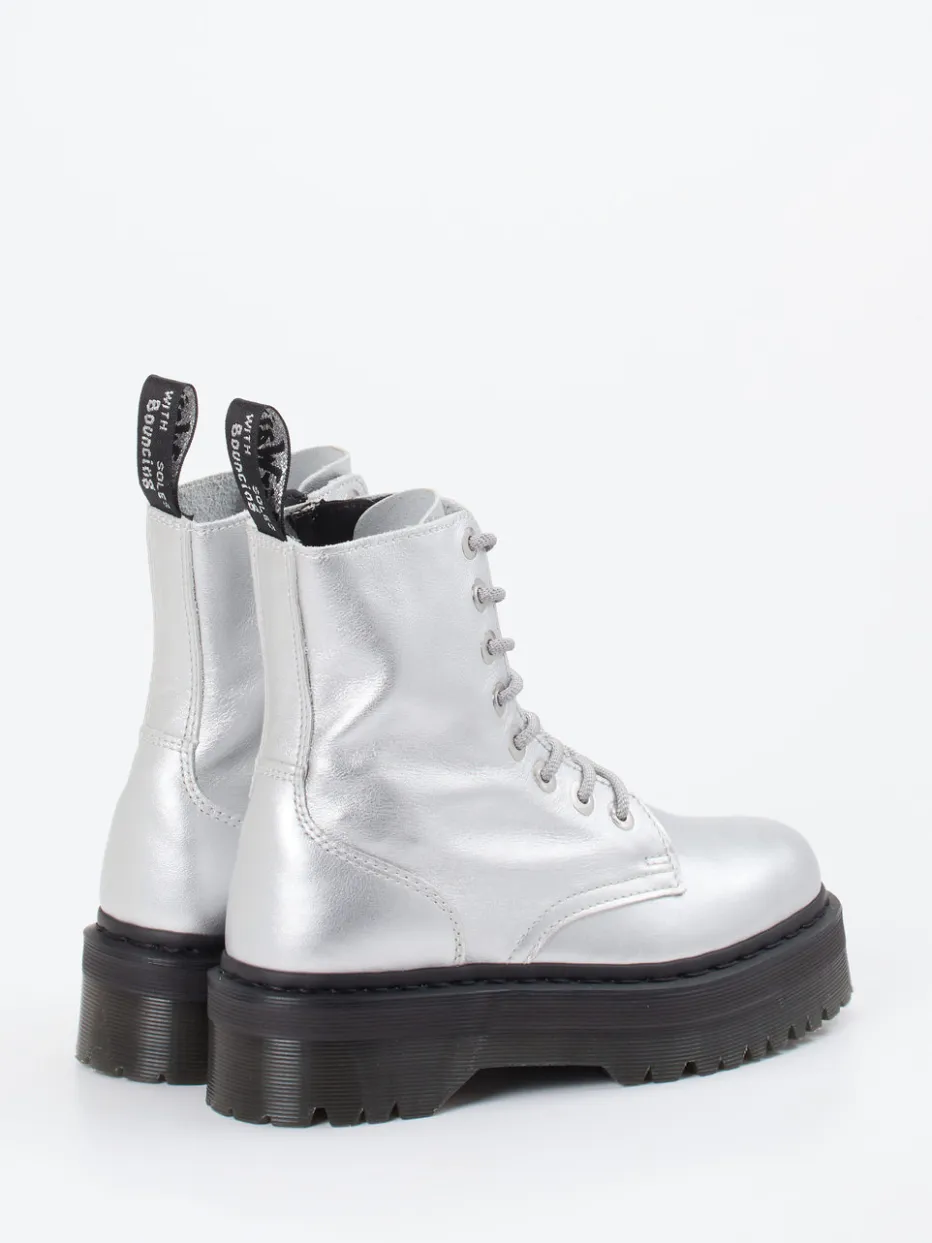 Die glänzenden Metallicleder-Oberflächen in Silber unterstreichen die punkige Silhouette mit breiter Plateausohle – ein Eyecatcher für urbane Looks. Die Kombination aus Schnürung und innenliegendem Reißverschluss erleichtert den Einstieg. Schwarze Zuglaschen mit Markenprint und kontrastierende Sohlennaht setzen zusätzliche Akzente. Inspiriert vom Punk Revival und aktuellen Metallic-Trends der Saison, eignen sich die Boots perfekt für Alltag und Night-Out. Besonders wirkungsvoll zu Oversize-Jacken oder minimalistischen Outfits.