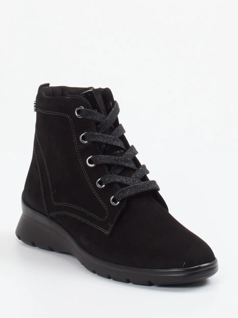 Diese knöchelhohen Boots verbinden samtig angeschliffenes Nubukleder mit dezenten Glitzerdetails zu einem fein ausbalancierten Komfortmodell für stilbewusste Trägerinnen.