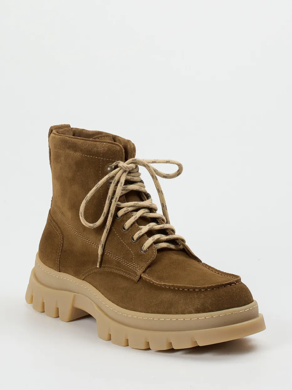 Henderson interpretiert klassische Schnürboots neu und setzt auf hochwertiges Veloursleder in warmem Cognacbraun.