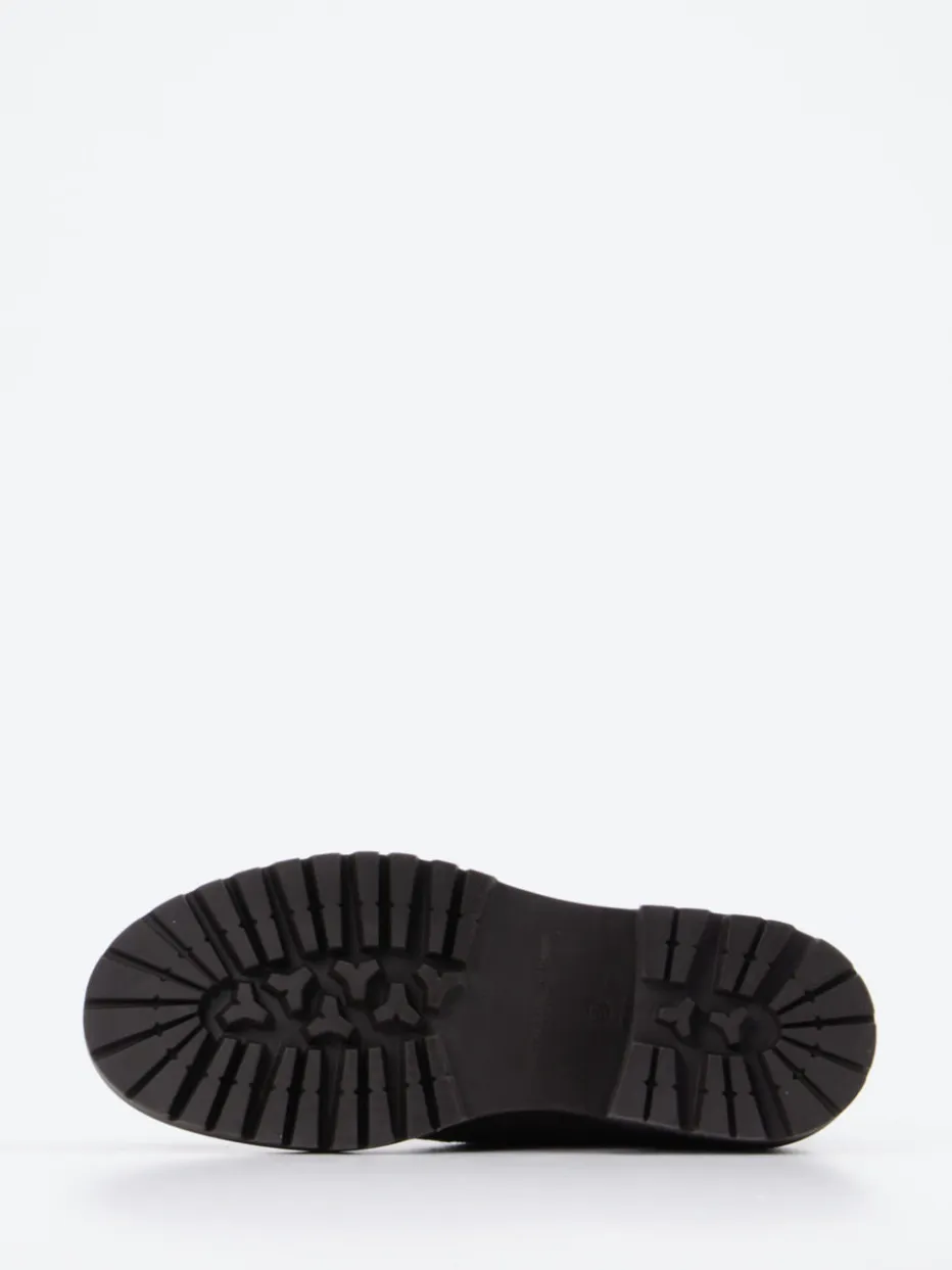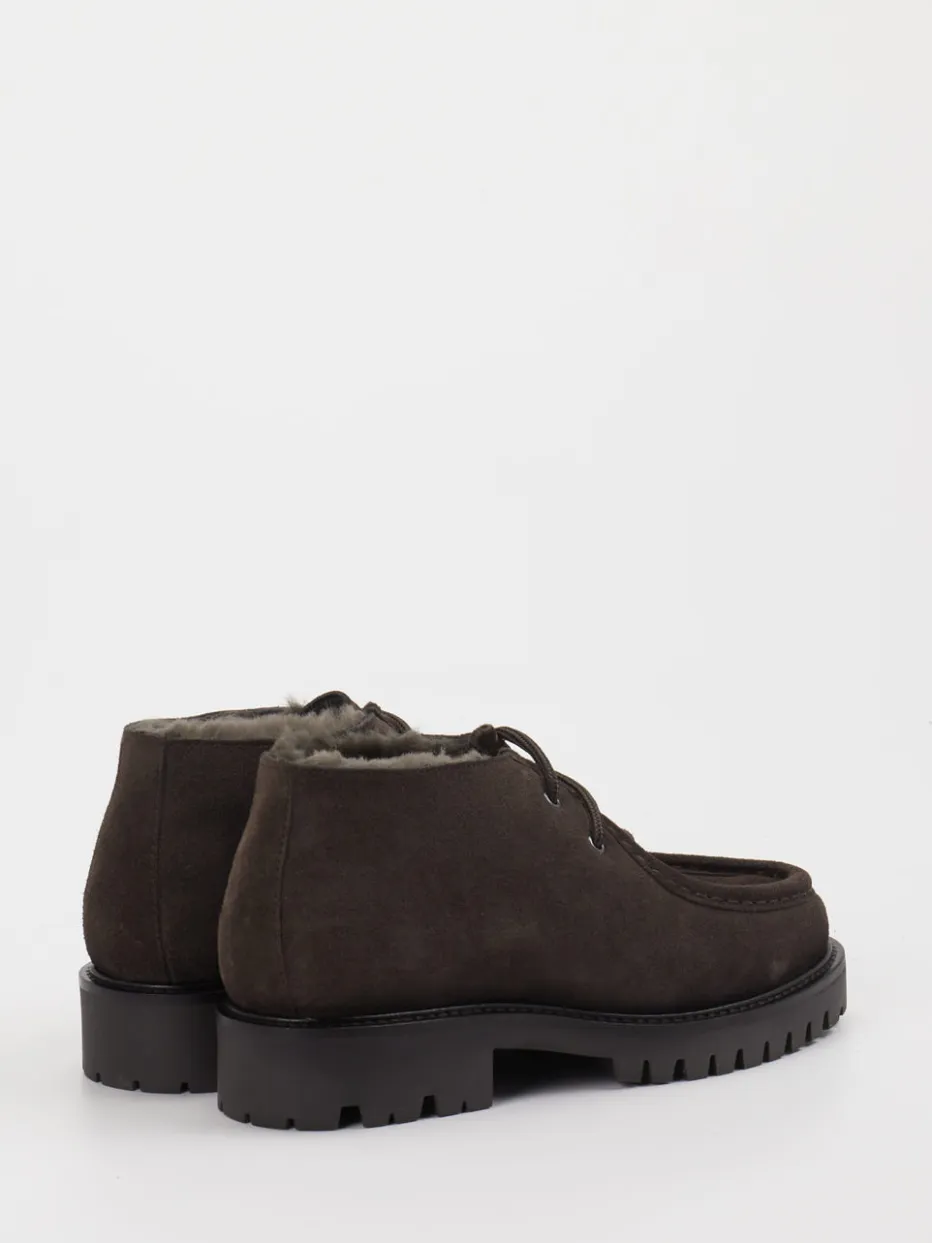 Ein weiches Veloursleder in Dunkelbraun und ein warmes Lammfellfutter sorgen für angenehmen Tragekomfort bei niedrigen Temperaturen. Die knöchelhohe, rund zulaufende Form mit dezenter Zweilochschnürung unterstreicht die reduzierte Ästhetik. Eine robuste schwarze Profilsohle aus Gummi bietet Trittsicherheit in der kalten Jahreszeit. Inspiriert vom Outdoor-Stil folgt das Design dem „Quiet Luxury“-Trend der Saison. Kombiniert mit Wollsocken und Parka besonders stilsicher.