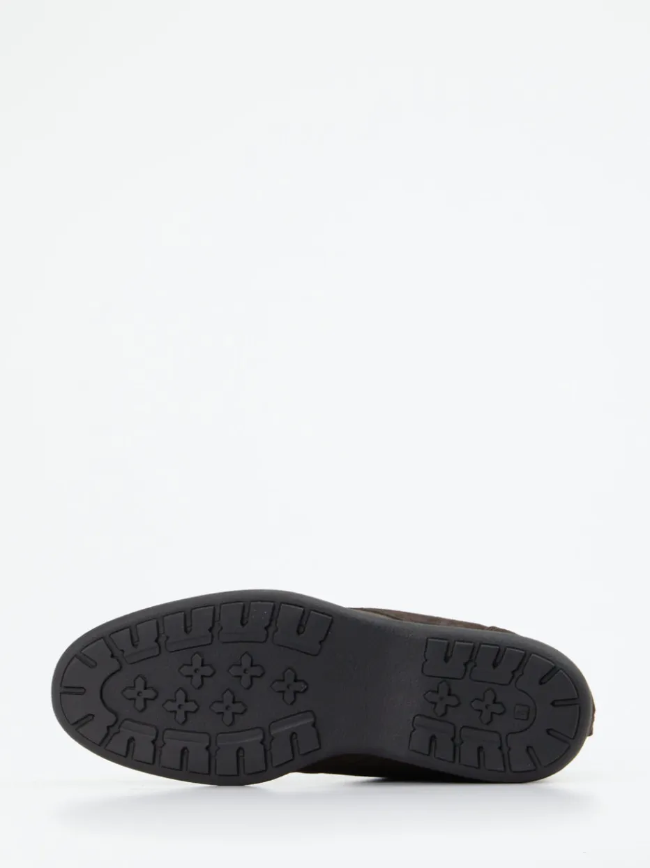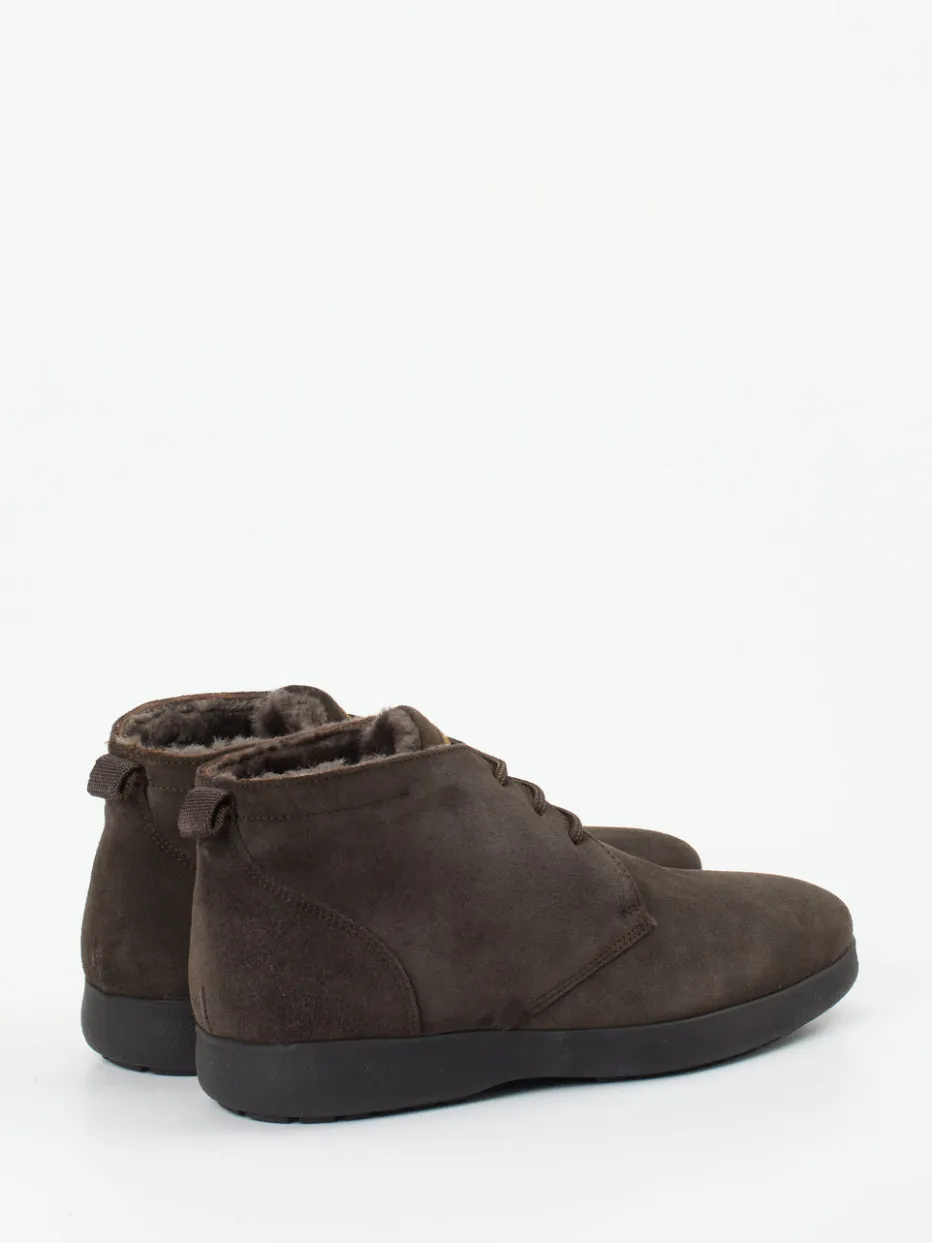 Bei winterlichen Spaziergängen oder auf dem Weg ins Büro sorgt das kaffeebraune Veloursleder mit matter Oberfläche für eine elegante Ausstrahlung. Das innen wärmende Lammfell und die schwarze, profilierte Gummisohle überzeugen mit Komfort und Rutschfestigkeit. Der knöchelhohe Schnitt mit Dreilochschnürung, Ton-in-Ton-Nähten und geprägtem Markenlabel an der Lasche entspricht einem puristischen Designansatz. Ideal für entspannte Alltagslooks und Homewear-Outfits. Dezente Utility-Akzente betonen den zeitlosen Charakter.
