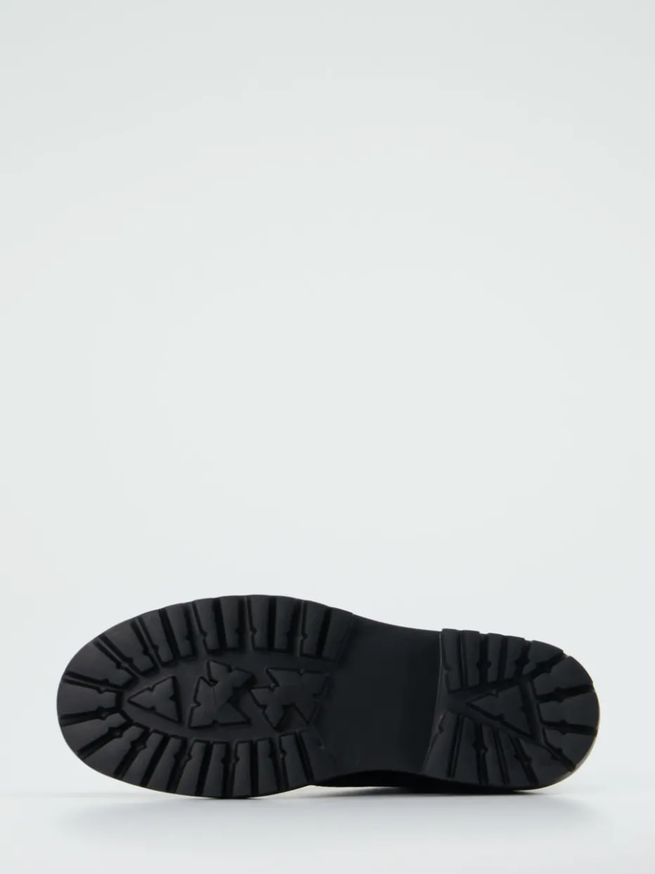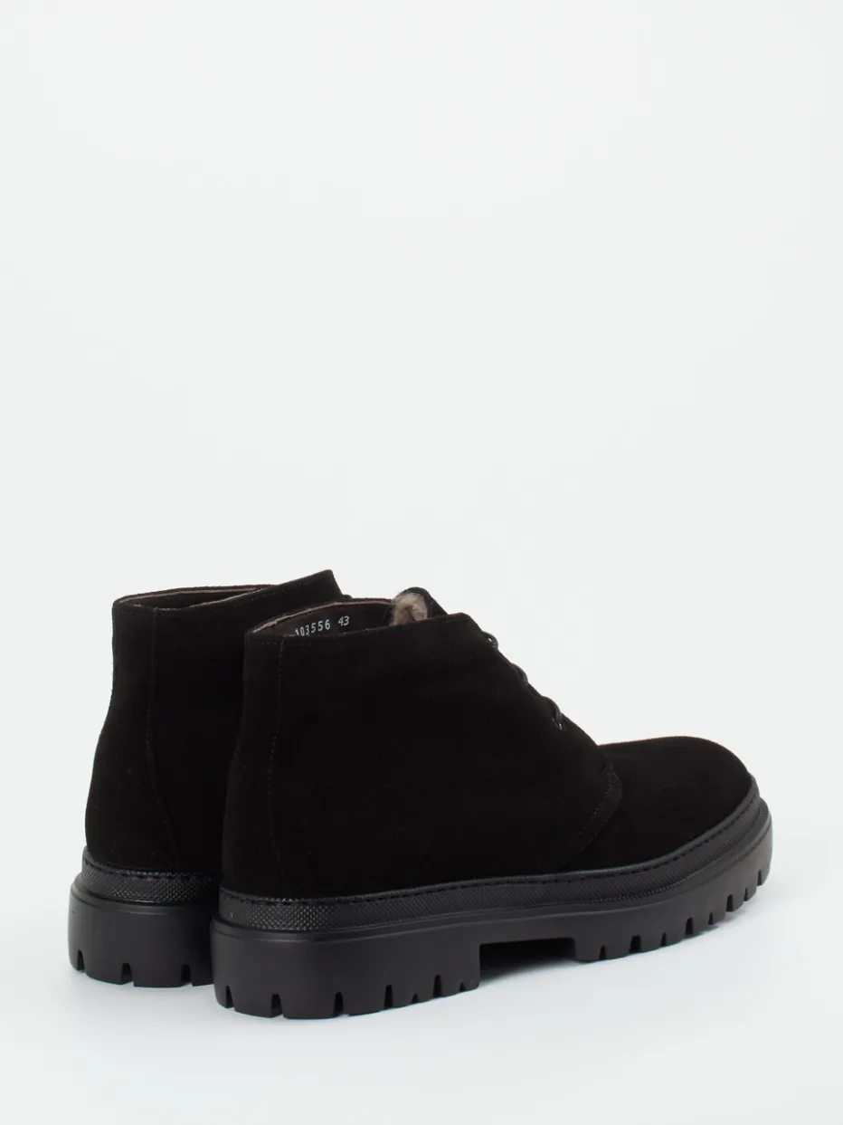 Vielseitigkeit für kalte Tage.Konstantin Starke zeigt mit diesen Herren-Schnürboots eine stilvolle Interpretation urbaner Desert Boots. Ideal für den Übergang und den Winter, bieten sie mit ihrem schwarzen Veloursleder, das samtig angeschliffen wirkt, und dem warmen Lammfellfutter maximalen Komfort. Die knöchelhohe Form, schwarze Ösen und tonale Nähte unterstreichen die klare Linienführung. Die auffällig profilierte Gummisohle passt zum „Lug Sole“-Trend und sorgt für Trittsicherheit im Alltag. Kombiniert mit Wollmantel oder Chino ergibt sich ein cleaner Streetwear-Auftritt. Ein souveräner Begleiter mit klarer Formensprache und hochwertiger Ausführung.