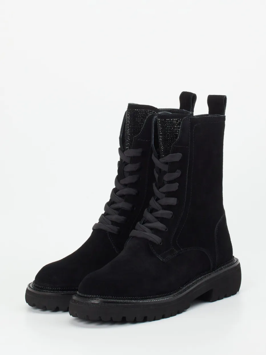 Robust trifft auf Glanz.Maripé präsentiert stilvolle Damen-Schnürboots für Herbst und Winter. Ideal für den alltäglichen Stadtbummel oder nächtliche Ausgehmomente kombinieren diese knöchelhohen Boots schwarzes Veloursleder mit einer samtig-matten Oberfläche und funktionalem PU-Blockabsatz. Der dezente Glitzerbesatz an Zunge und Fersenstreifen bringt stilvolle Raffinesse ins Design, während die profilierte Sohle sicheren Halt bietet. Dank Schnürung und Innenreißverschluss ist der Einstieg komfortabel. Inspiriert von Utility-Ästhetik und dem Subtle-Sparkle-Trend sind diese Boots ein Trend-Update für trendorientierte Streetstyle-Looks. Authentisches Design und hochwertiger Komfort – Maripé verbindet beides gekonnt.