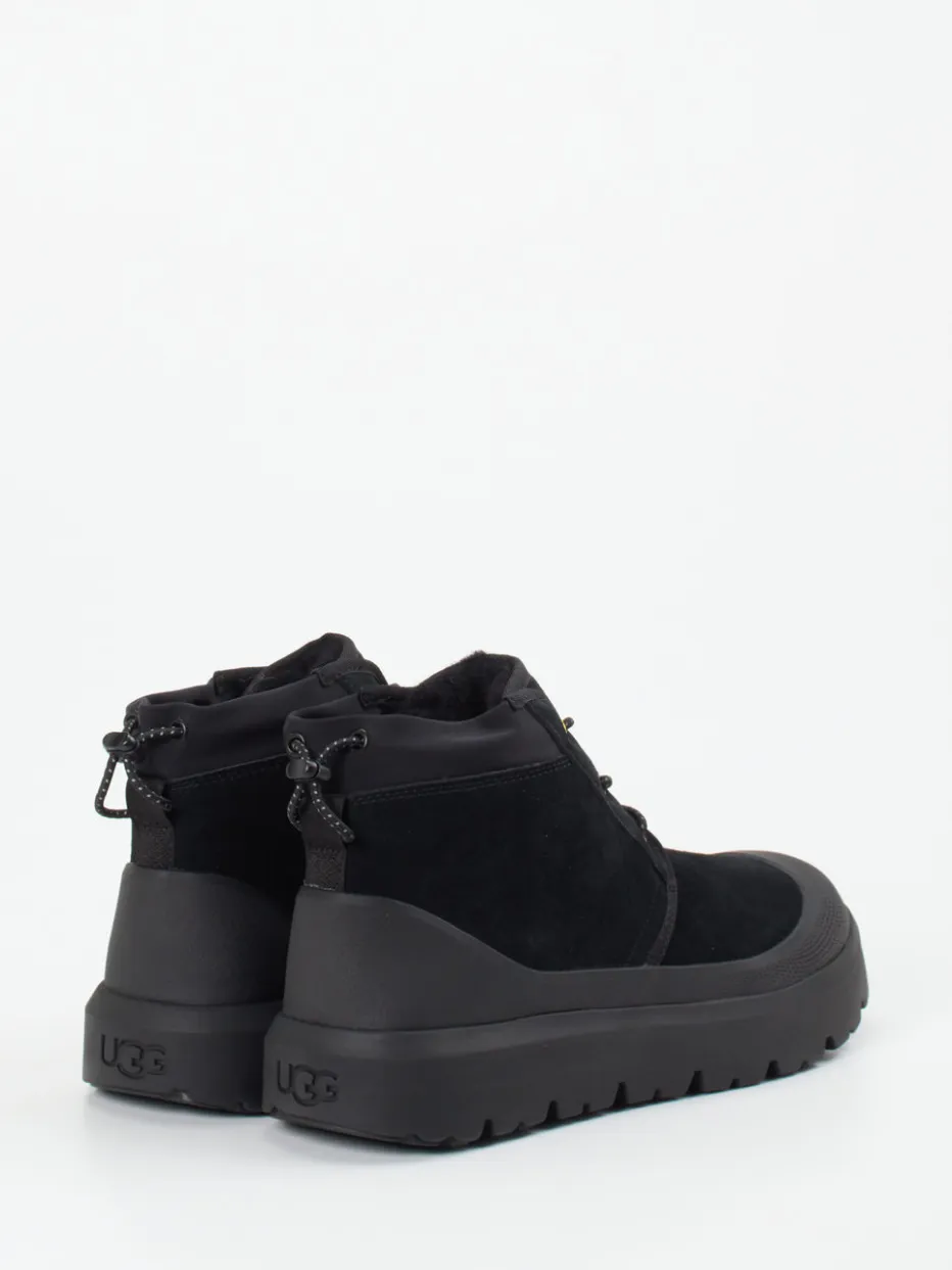 UGG steht bei diesen knöchelhohen Schnürboots für funktionales Design im Streetwear-Stil. Die gefütterte Veloursleder-Ausführung in tiefem Schwarz bietet mit reflektierenden Schnürsenkeln, gelben Ösen und gummierter Zehenkappe markante Akzente. Das matte Leder unterstreicht den urbanen Utility-Look, ergänzt durch die stark profilierte Sohle, die selbst bei Glätte zuverlässigen Halt gibt. Die wetterfeste Gestaltung mit Kordelzug am Schaftabschluss schützt effektiv gegen Nässe und Kälte. Perfekt kombinierbar mit Outdoorjacken und lässigen Stoffhosen.
