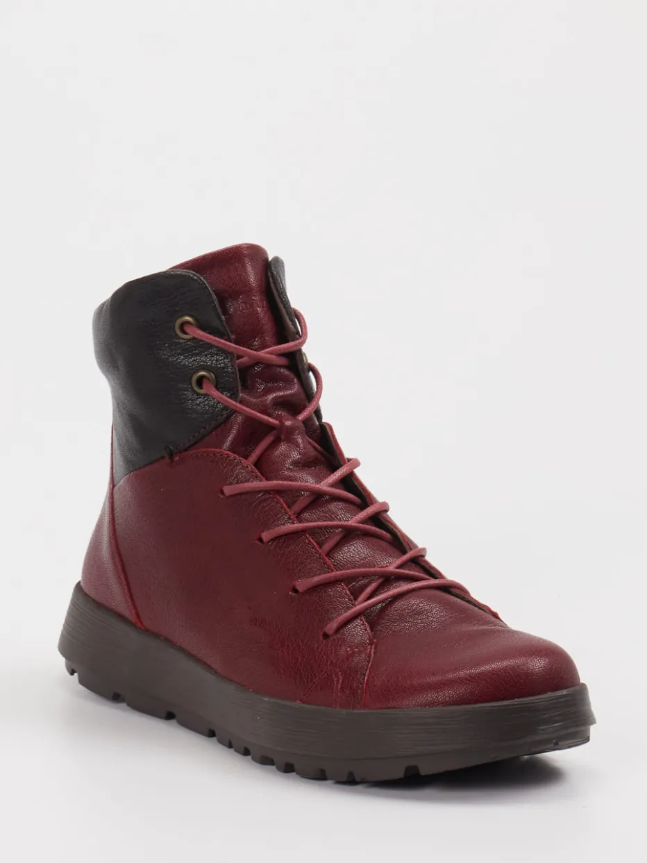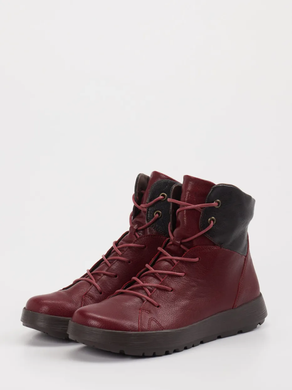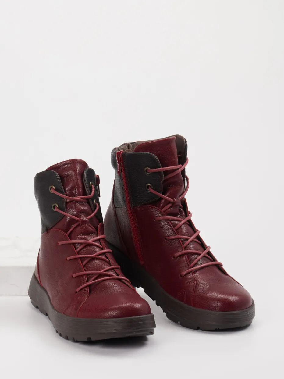 Die bordeauxroten Schnürboots von Think vereinen robustes Design mit urbanem Komfort und überzeugen durch funktionale Details wie Reißverschluss und griffige Profilsohle.