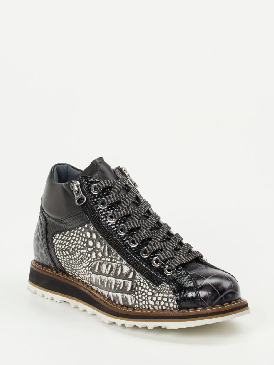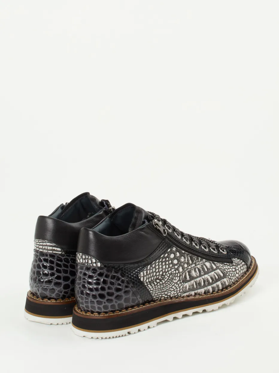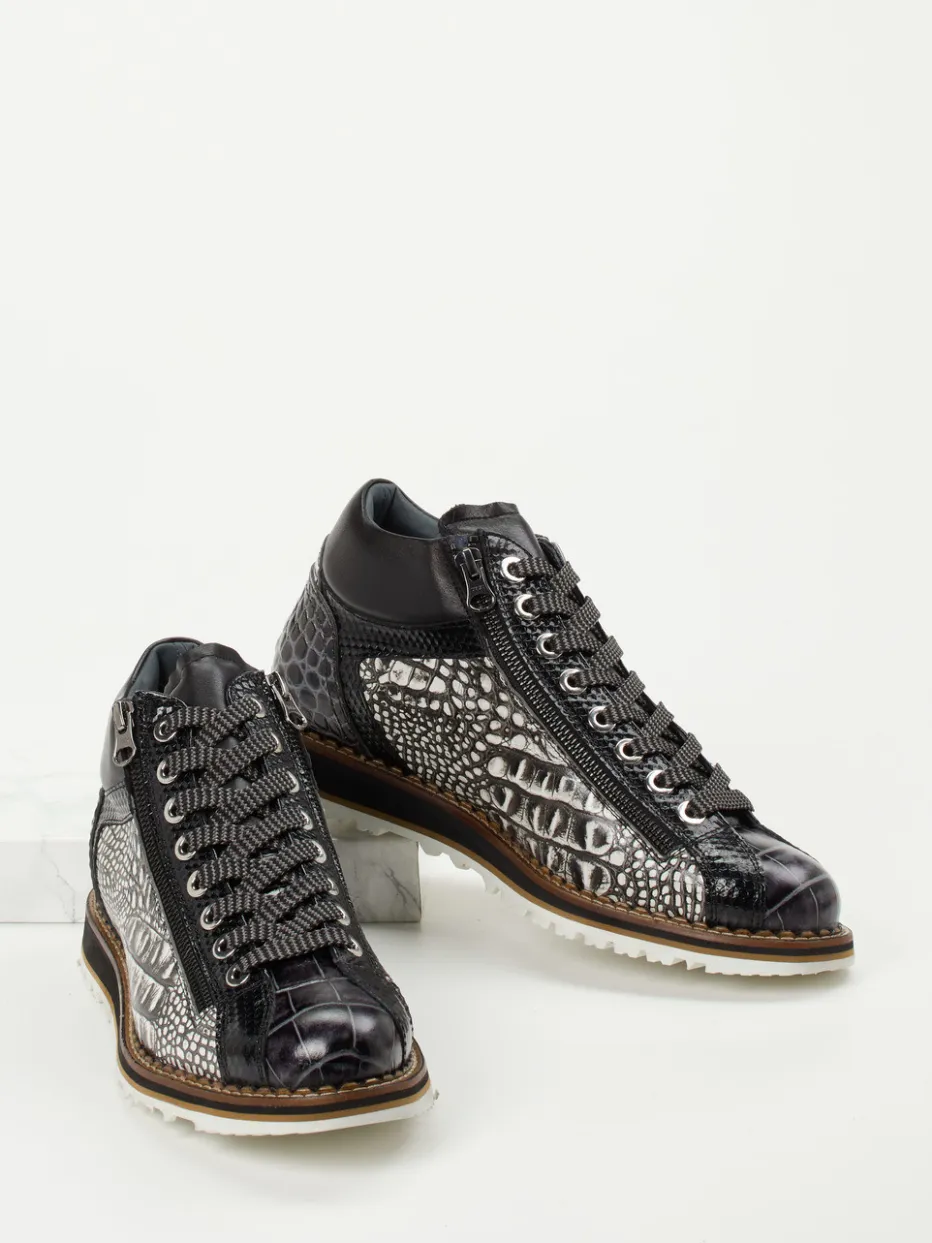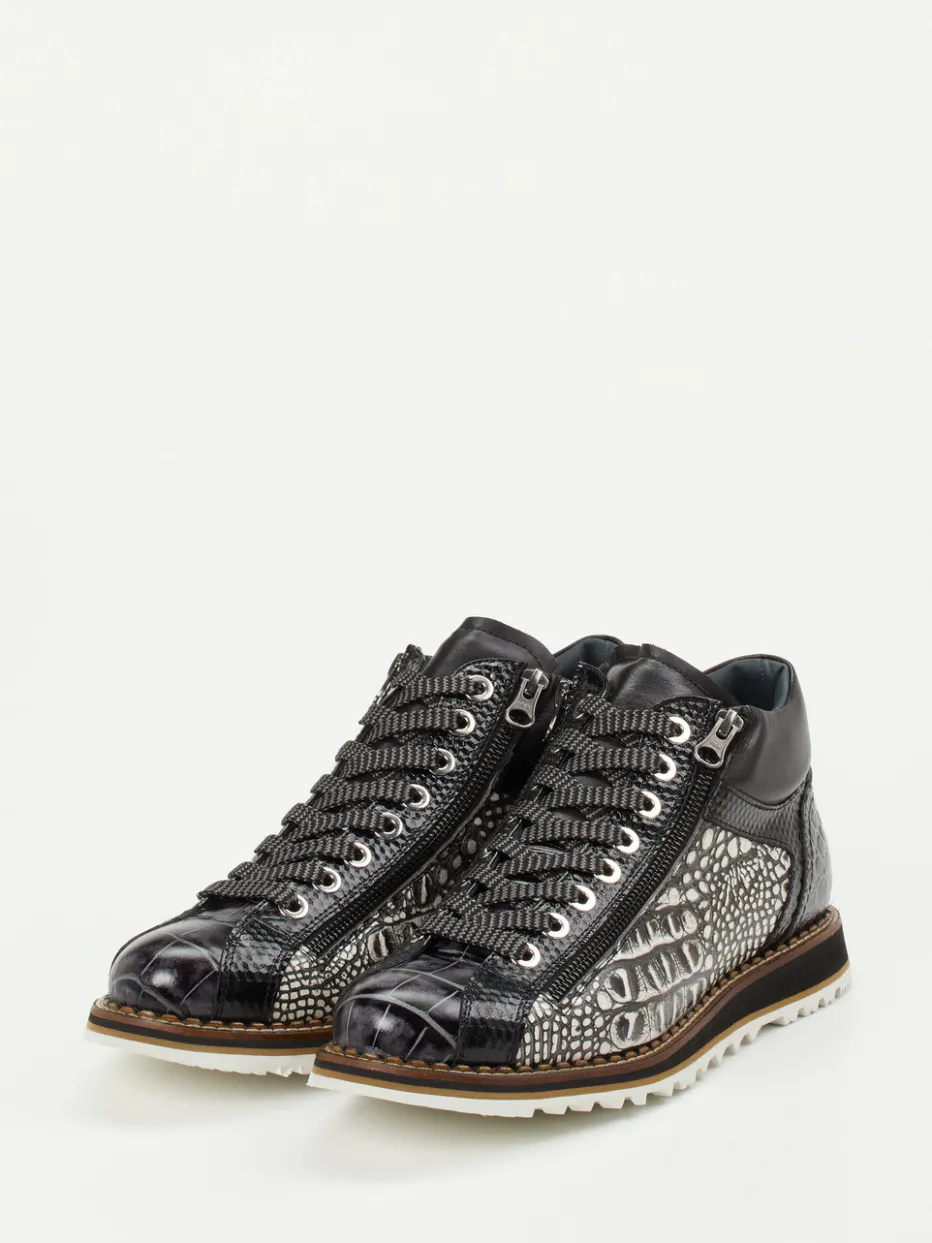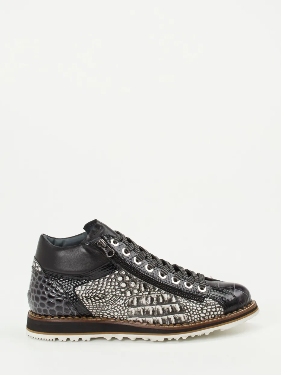 Modische Reptiltextur trifft funktionales Detail: Dieser Sneaker vereint glänzendes Kroko-Leder mit moderner Streetwear-Attitüde.