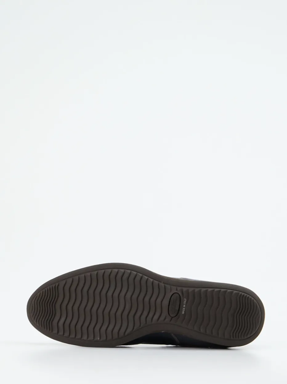 Stil trifft Komfort im Alltag.Galizio Torresi präsentiert mit diesem Schnürschuh ein Modell, das sportliche Eleganz und Bequemlichkeit vereint. Ob für den Arbeitsalltag oder urbane Freizeitmomente – dank extra weiter Passform und gepolstertem Wechselfußbett garantiert der Schuh angenehmen Tragekomfort. Gefertigt aus dunkelblauem Kalbleder mit glatter, leicht glänzender Oberfläche und cognacfarbenen Kontrastdetails bietet er visuelle Tiefe und Retro-Charme. Die flache, abgerundete Silhouette mit Schnürung, gepolstertem Schaftrand und profilierter Gummisohle rundet das Design funktional ab. Inspiriert von Retro-Sportswear, passt er hervorragend zu dunkelblauen Chinos oder cognacfarbenen Accessoires. Markentypische Qualität verbindet italienisches Design mit tragbarem Stilgefühl.