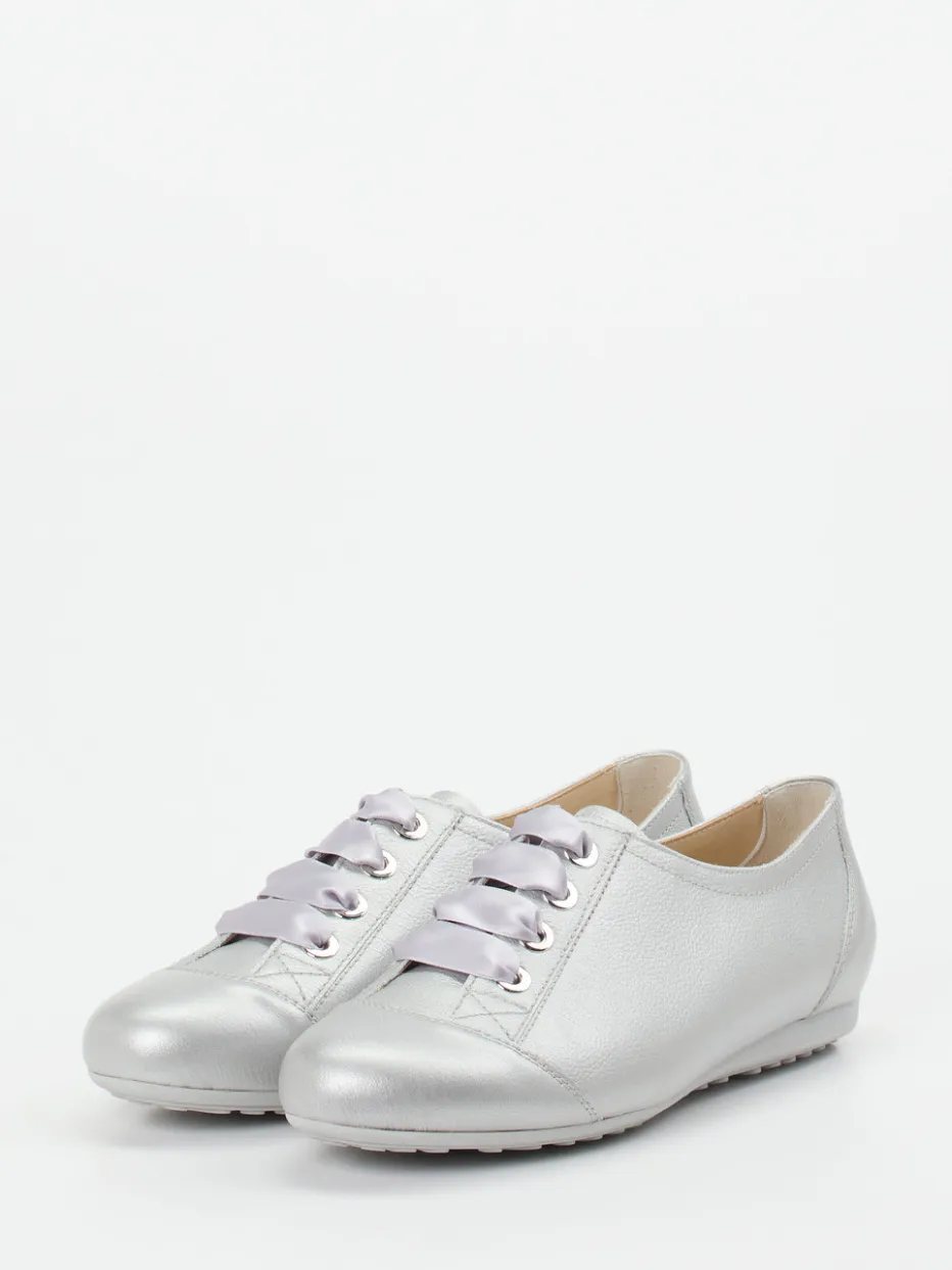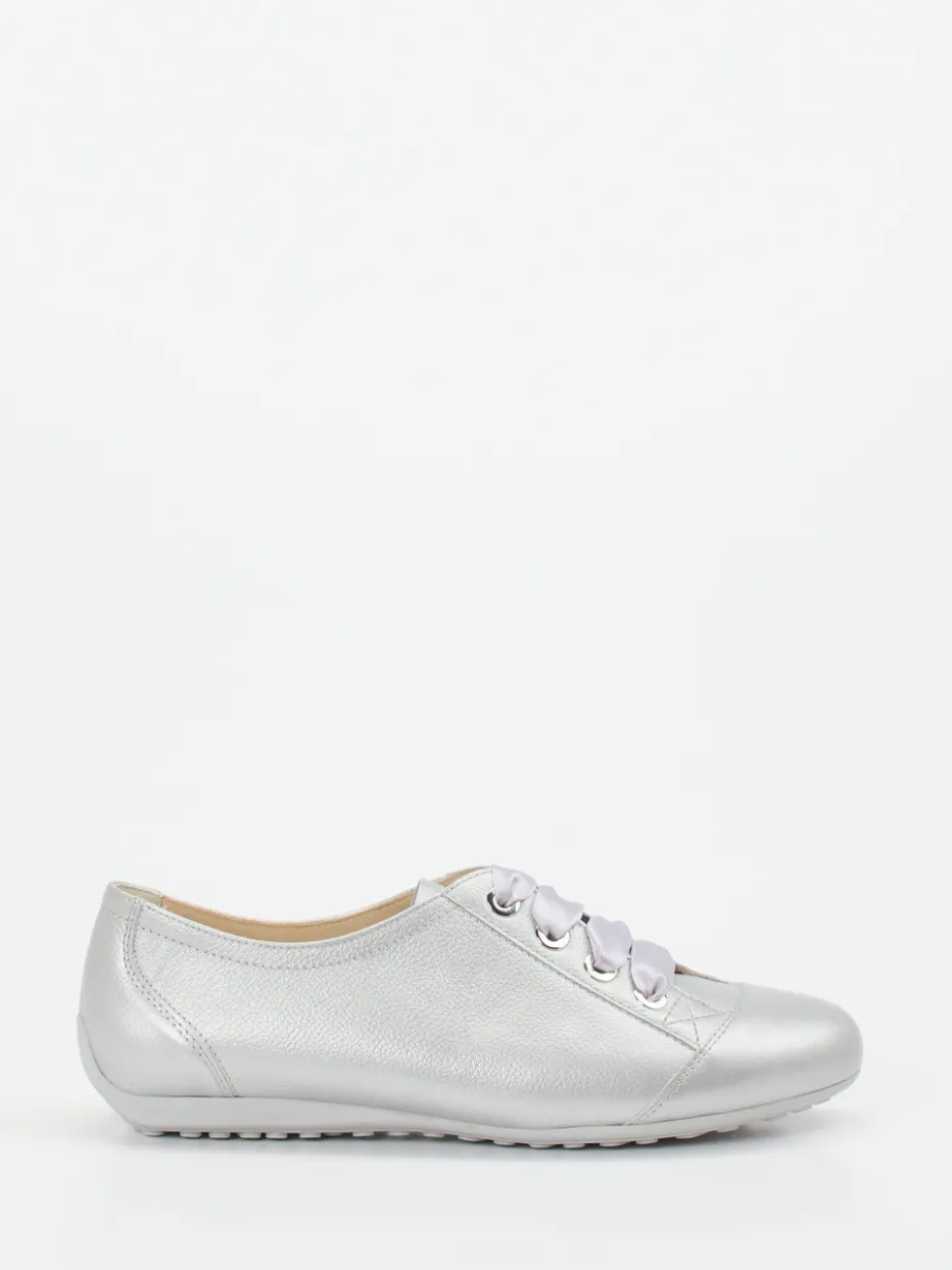 Für entspannte Alltagseinsätze bietet das Modell ein bequemes Tragegefühl und dezente Raffinesse. Das verwendete Metallicleder zeigt eine edel genarbte Oberfläche, während die Schnürung mit Satinband eine feminine Note einbringt. Die flache Silhouette in Silber und die gepolsterte Ferse unterstreichen den sportiv-lässigen Charakter. Die profilierte Gummisohle verleiht Trittsicherheit, auch bei entspannter Homewear. Der Look liegt ganz im Metallic-Akzent-Trend der Saison.