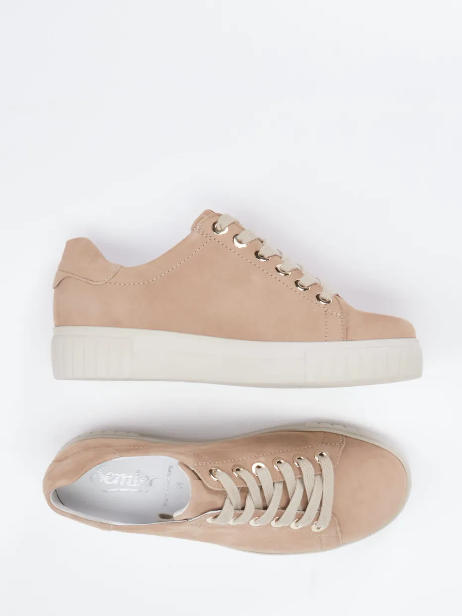 Beiger Minimalismus trifft Komfort.Semler zeigt mit diesem Damen-Sneaker ein bequemes Modell für Alltag und Freizeit. Weich gepolstert und mit luftiger PU-Sohle ausgestattet, sorgt der Low-Top-Sneaker aus samtig angeschliffenem Nubukleder für angenehmes Gehen – auch bei längeren Strecken. Der beigefarbene Monochrom-Look erhält durch goldene Metallösen und fein ausgearbeitete Steppnähte subtile Akzente. Dank Weite H und herausnehmbarer Innensohle eignet sich der Schuh auch für Einlagen. Die klare, flache Silhouette passt zu entspannten Looks im „Quiet Luxury“-Stil. Ein lässiger Wohlfühlschuh mit markentypischem Qualitätsanspruch.