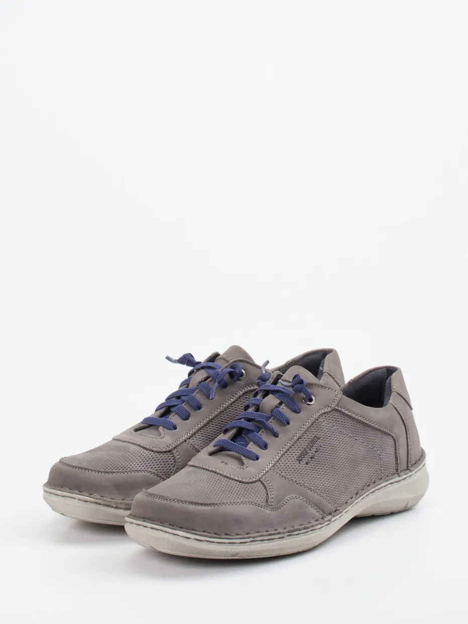 Schlicht und bequem durch den Alltag.Josef Seibel präsentiert in der Kategorie Schnürschuhe einen zeitgemäßen Casual-Sneaker für Herren. Ideal für entspannte Freizeitmomente bietet das Modell mit seinem samtig genarbten Nubukleder ein hochwertiges Tragegefühl. Die Kombination aus grauer Grundfarbe und dunkelblauen Details verleiht diesem Schuh eine zurückhaltend sportive Ausstrahlung. Klassisch gerundet in der Silhouette, mit tonigen Nähten und geprägtem Seitenlogo, trifft er die Designsprache urbaner Minimalisten. Dank gepolstertem Einstieg und rutschhemmender Gummisohle bietet er zuverlässigen Komfort und sicheren Halt – etwa beim Spazieren in der Stadt. Harmoniert besonders gut mit Jeans und Softshelljacke. Ein entspannter Begleiter im Zeichen unaufdringlicher Qualität.