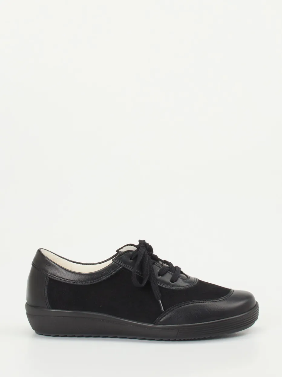 Schwarz trifft Komfort.Christian Dietz präsentiert hier einen bequemen Schnürschuh für Damen. Ideal für lange Tage auf den Beinen bietet dieses Modell durch die Weite H und die gepolsterte Gummisohle ein Plus an Tragekomfort. Die Kombination aus Stretchmaterial, Glattleder und samtigem Veloursleder sorgt für Flexibilität und ein angenehmes Tragegefühl. Die tonale Farbgebung in Schwarz, das dezente Oberflächenspiel sowie die abgerundete Form wirken modern und zurückhaltend. Die herausnehmbare Innensohle unterstreicht den funktionalen Designanspruch. Dank minimalistischer Linienführung ergänzt der Schuh vielseitige Alltags- und Freizeitoutfits. Ein besonders tragbarer Komfortfavorit für anspruchsvolle Füße.