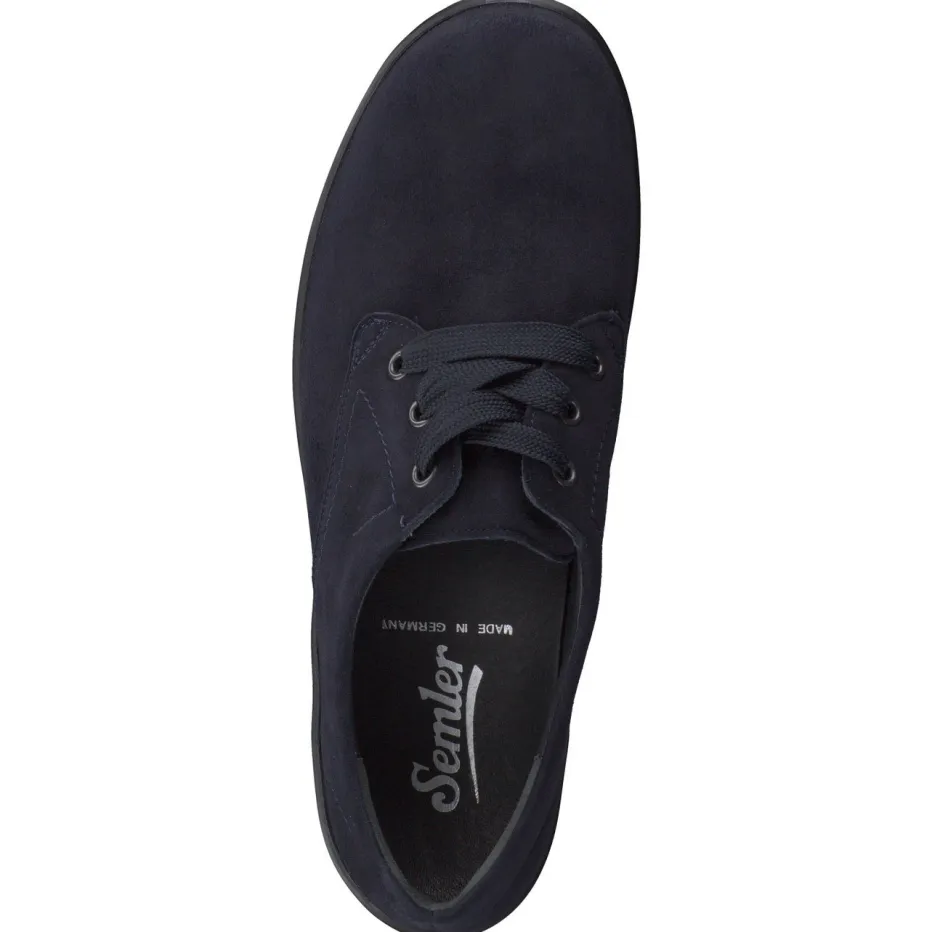 Komfort trifft Understatement.Semler bietet mit diesem klassischen Damen-Schnürschuh ein hochwertiges Modell für vielseitige Einsätze. Ideal bei vollem Terminkalender: Das samtig angeschliffene Veloursleder in Dunkelblau wirkt dezent elegant, während die klassische Rundform und Ton-in-Ton-Nähte zurückhaltend stilvoll bleiben. Die tonige Schnürung in schwarzen Ösen sorgt für Halt, ein gepolsterter Einstieg sowie ein ergonomisch profiliertes Luftpolster sorgen für dauerhaften Komfort. Das wechselbare Vario-Fußbett und die flexible PU-Sohle ergänzen die funktionale Ausstattung. Minimalistische Linienführung trifft auf Quiet Comfort – perfekt zu grauer Stretchhose oder Lederhandtasche. Semler verbindet traditionelle Verarbeitung mit zeitgemäßem Komfort für anspruchsvolles Gehen.