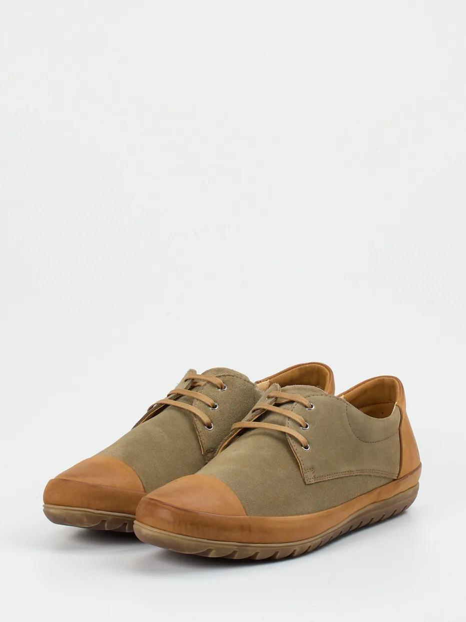 Vielseitigkeit in Naturtönen.Franz Gustav präsentiert mit diesem Casual Derby aus der Linie „Freilauf“ ein modernes Herrenmodell für den urbanen Alltag. Olivgrünes Veloursleder, samtig angeschliffen und matt, trifft auf cognacfarbenes Glattleder – ein klarer Kontrast, der den minimalistischen Stil unterstreicht. Die profilierte Gummisohle sorgt für sicheren Tritt und Flexibilität, während die flache, abgerundete Form sportliche Lässigkeit vermittelt. Dezente Ton-in-Ton-Schnürsenkel und Metallösen ergänzen das cleane Design. Ideal kombinierbar mit Chinos oder Lederjacken in Naturtönen. Ein komfortbetonter Begleiter mit ruhiger Farbigkeit und urbanem Anspruch – typisch Franz Gustav.
