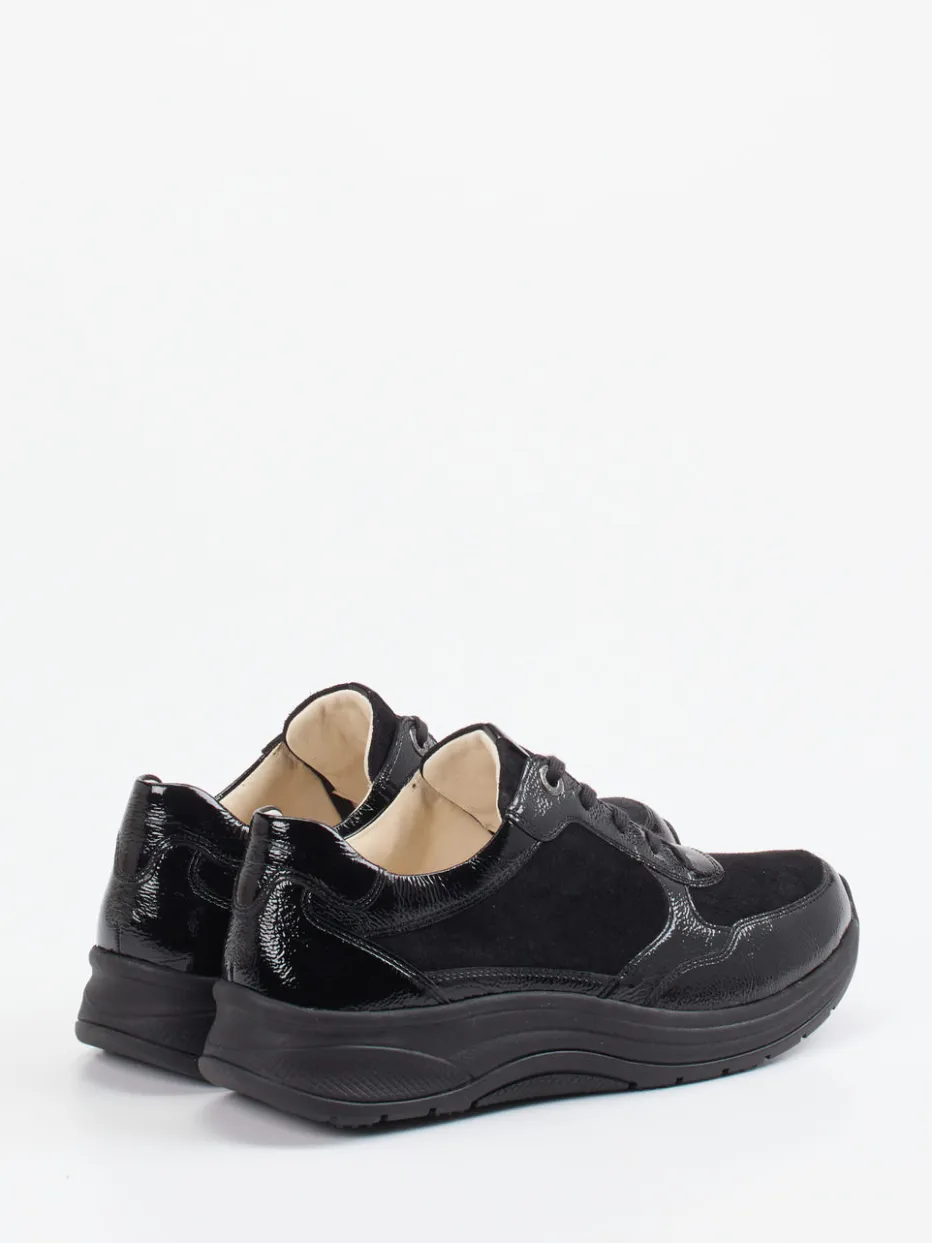 Dieser Damen-Sneaker von Ganter vereint ergonomischen Komfort mit einem ausdrucksstarken Materialmix aus mattem Veloursleder und glänzendem Lackleder – ideal für stilbewusste Minimalistinnen.
