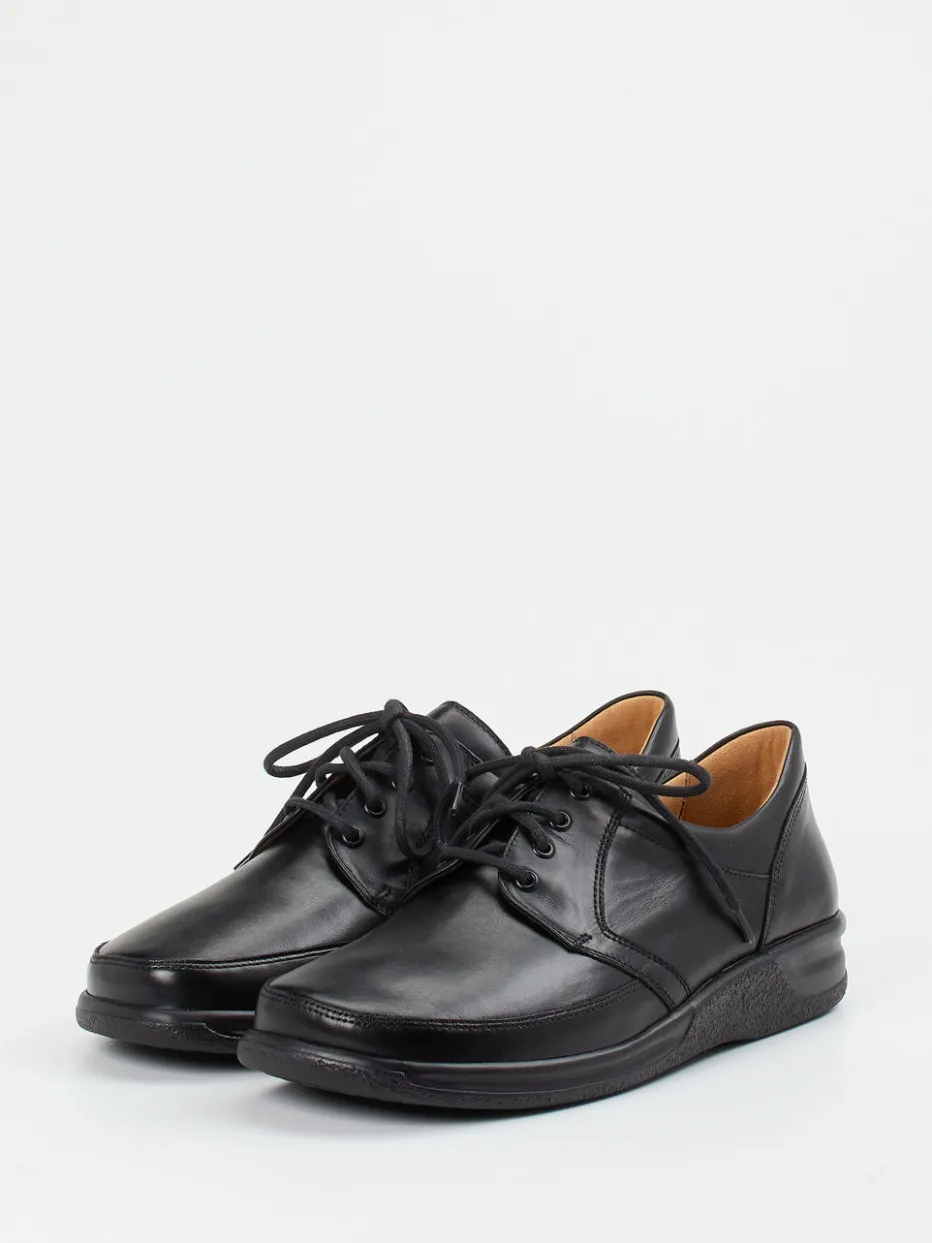 Perfekt geeignet für lange Tage im Büro oder ausgedehnte Spaziergänge in der Stadt: Das weiche, schwarze Kalbleder mit mattierter Oberfläche und Ton-in-Ton-Nähten sorgt für eine elegante Zurückhaltung. Gepolsterter Schaftrand und Zunge entlasten empfindliche Fußbereiche, während das lederbezogene Vario-Kork-Fußbett höchste Ergonomie bietet. Die Gummisohle mit rutschhemmendem Profil vereint Sicherheit mit Komfort. Durch sein minimalistisches Design fügt sich das Modell nahtlos in Alltags- und Bürooutfits ein. Harmoniert optimal mit einem schwarzen Ledergürtel oder Business-Socken.