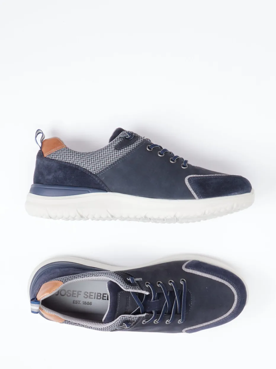 Sportlicher Komfort für den Alltag.Josef Seibel präsentiert einen stilvollen Herren-Sneaker in der Kategorie Schnürschuhe. Ideal für entspannte Tage in der Stadt oder unterwegs im Alltag: Das Modell vereint robustes Nubukleder mit samtig angeschliffener Oberfläche und atmungsaktive Mesh-Einsätze. Optisch setzen sich das dunkle Blau, hellgraue Kontraste und cognacfarbene Akzente stilvoll ab. Das sportlich-runde Design mit Zuglasche und weich gepolstertem Einstieg sorgt für angenehmen Halt und ein leichtes Tragegefühl – ideal im Kontext des aktuellen Quiet-Comfort-Trends. Die rutschfeste Gummisohle bietet sicheren Grip auf verschiedenen Untergründen. Verlässlicher Allrounder mit markentypischem Komfortfokus.