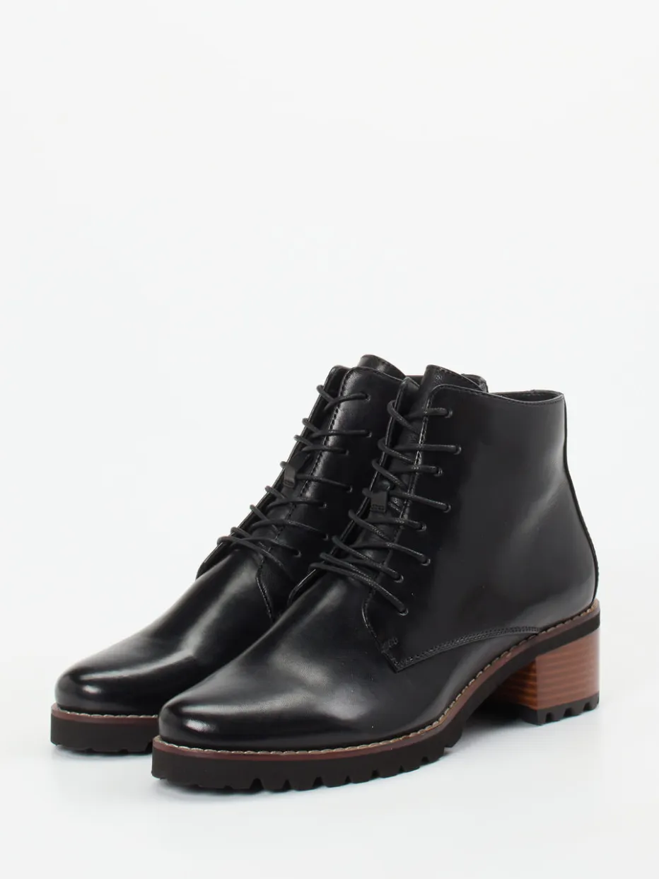 Ideal für herbstliche City-Looks: Das butterweiche Leder zeigt sich leicht glänzend und schmiegt sich an den schmal geschnittenen Leisten. Ein seitlicher Reißverschluss ergänzt die filigrane Schnürung für schnelles Anziehen. Die markante Gummisohle mit Kreuzprofil verleiht Trittsicherheit, während das atmungsaktive Futter innen für angenehmen Komfort sorgt. Minimalistische Formgebung und ein Blockabsatz in Holzoptik runden den Look ab. Lässt sich vielseitig zu Wollmantel oder Hosenanzug kombinieren.