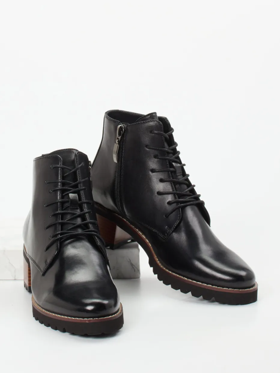Ralph Harrison präsentiert eine klassische Damen-Schnürstiefelette aus edlem, schwarzem Lammleder.