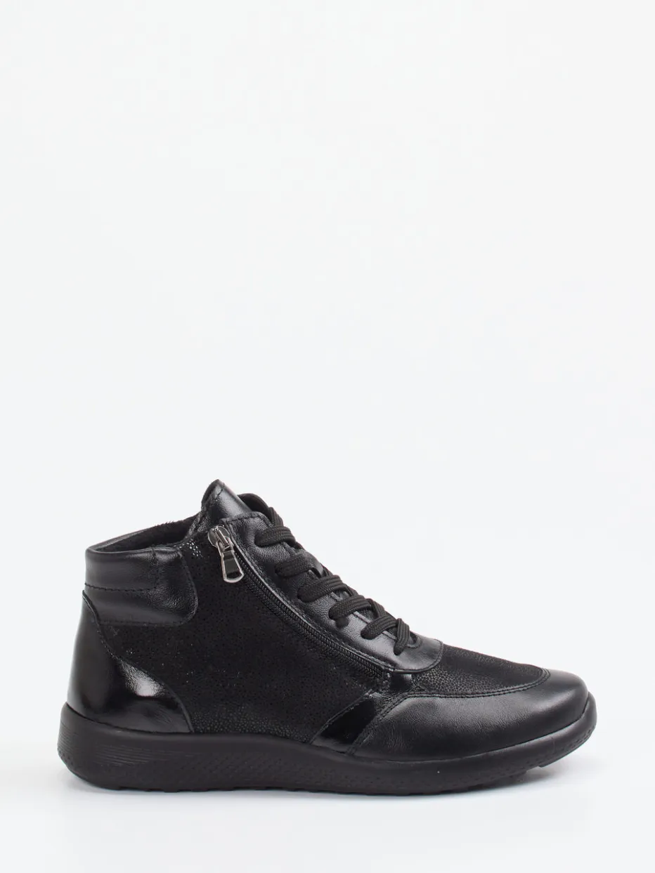 Für entspannte Tagesausflüge oder den Stadtbummel bei Herbstwetter bietet das Modell mit Stretchleder-Oberfläche, ergänzt durch feinsamtiges Velours- und glänzendes Kalbsleder, besten Tragekomfort. Die schwarze Farbgebung wird durch dezente Glanzeffekte und eine rund zulaufende, knöchelhohe Silhouette unterstrichen. Reißverschluss und Schnürung erleichtern den Einstieg; das microfasergefütterte Innere mit Soft-Fußbett in Weite K verspricht eine angenehme Passform. Die flexible PU-Profilsohle sorgt für guten Halt im urbanen Alltag und passt ideal zum „Quiet Luxury“-Trend.