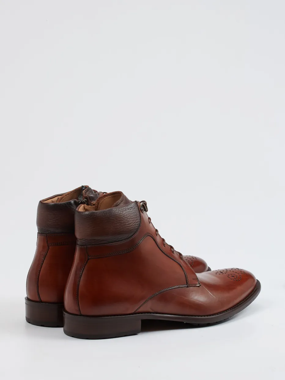 Für Geschäftstermine oder gepflegte Freizeitoutfits bietet der Schuh stilvolle Vielseitigkeit. Das cognacfarbene Kalbleder ist fein glänzend verarbeitet und lässt das Brogue-Lochmuster besonders elegant zur Geltung kommen. Die Kombination aus Schnürung mit Metallösen und seitlichem Reißverschluss sorgt für einen komfortablen Einstieg. Der zweifarbige, leicht abgesetzte Schaftabschluss verleiht dem schlanken Schnitt eine dezente Raffinesse. Die profillierte Leder-Gummisohle unterstreicht den smarten Heritage-Charakter und bietet Trittsicherheit.