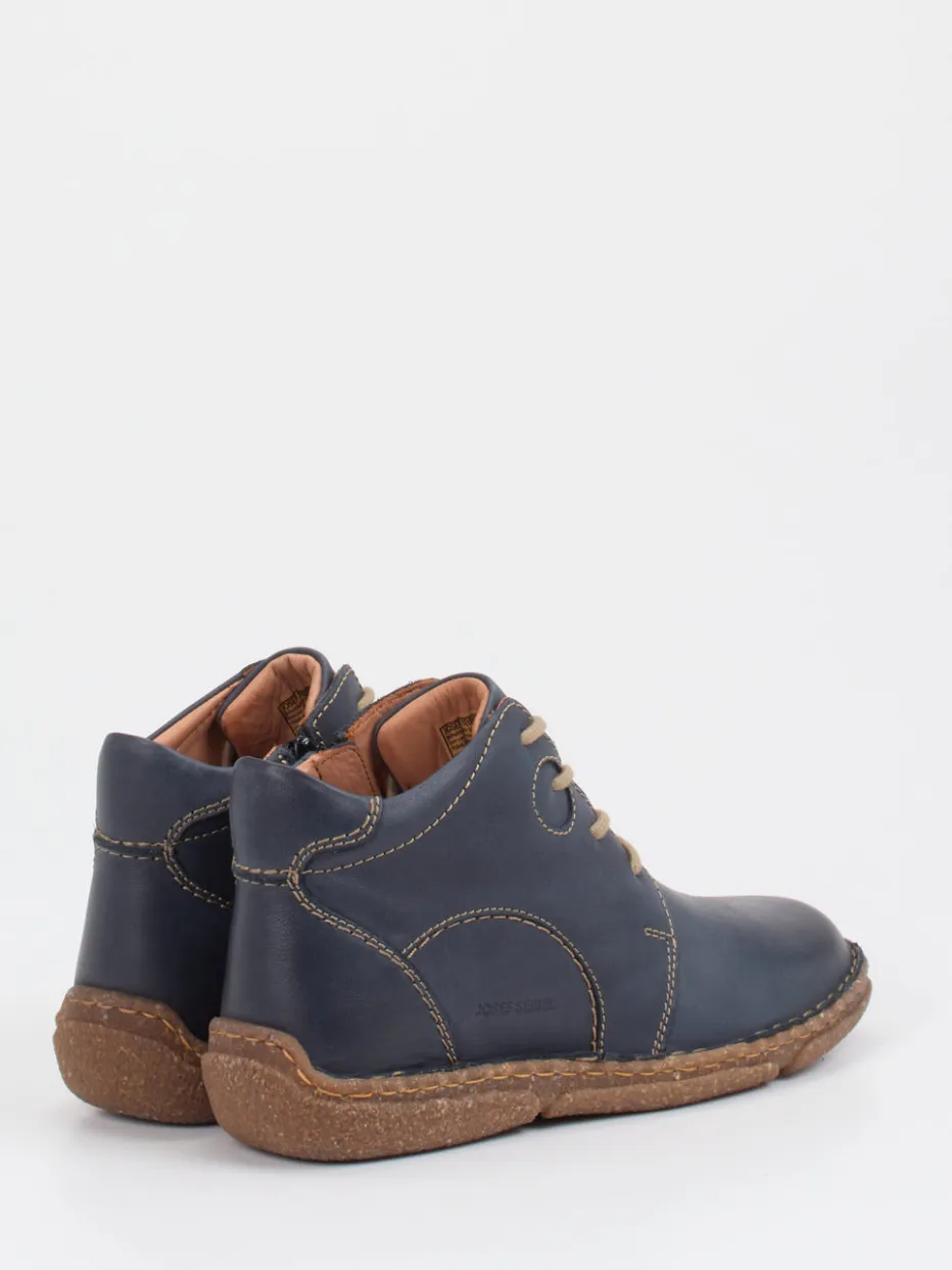 Naturnaher Look für entspannte Tage.Josef Seibel präsentiert diese komfortablen Schnürstiefeletten für Damen. Ideal für Freizeit und Alltag bietet das Modell dank der Kombination aus geschmeidigem Kalbleder mit matter Oberfläche und gepolstertem Einstieg hohen Tragekomfort. Die dunkelblaue Farbgebung mit beigen Kontrastnähten, naturfarbenen Schnürsenkeln und einem seitlichen Reißverschluss verleiht der knöchelhohen Silhouette eine lässige Authentizität. Eine flexible Sohle aus Naturkautschuk und das weich ausgekleidete Innenfutter sorgen für Komfort bei jedem Schritt. Der reduzierten Formensprache liegt ein skandinavisch inspirierter Komfortstil zugrunde. Ein durchdachter Begleiter mit nachhaltiger Note für stilvolle Ungezwungenheit.