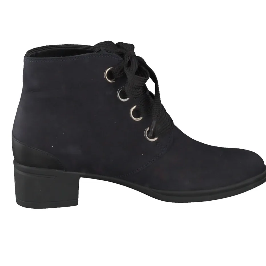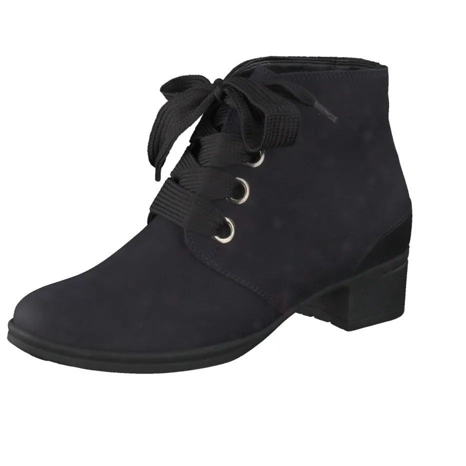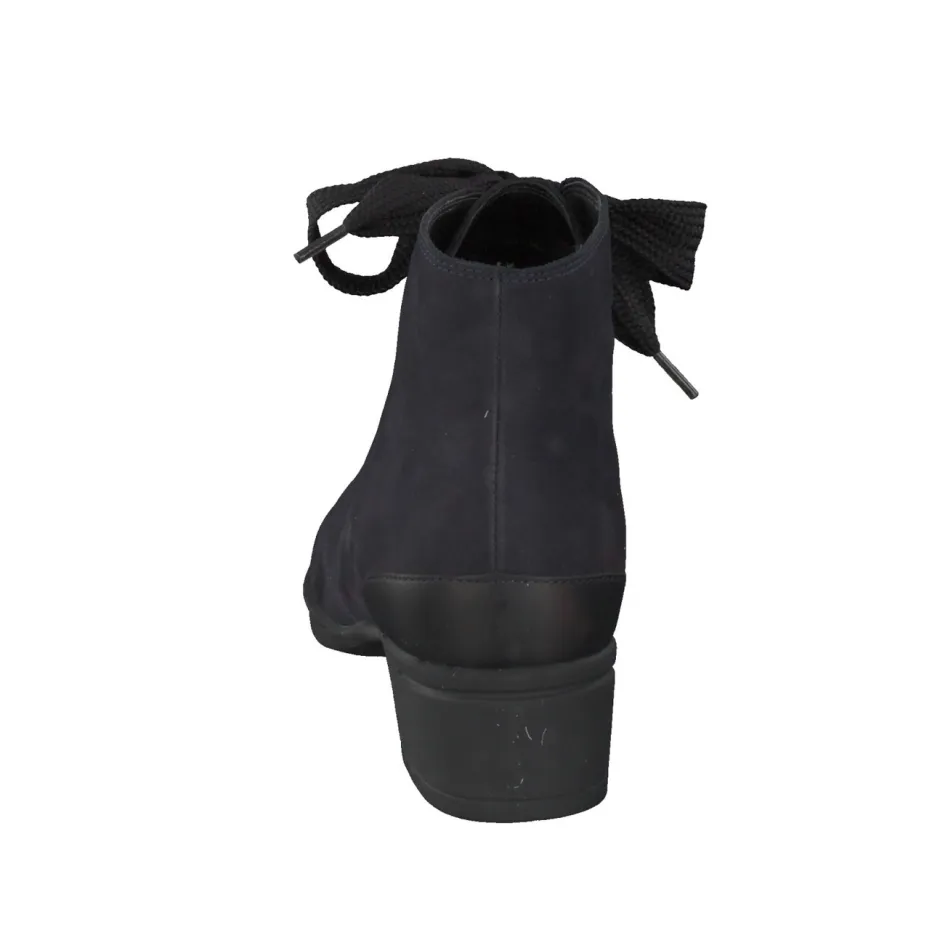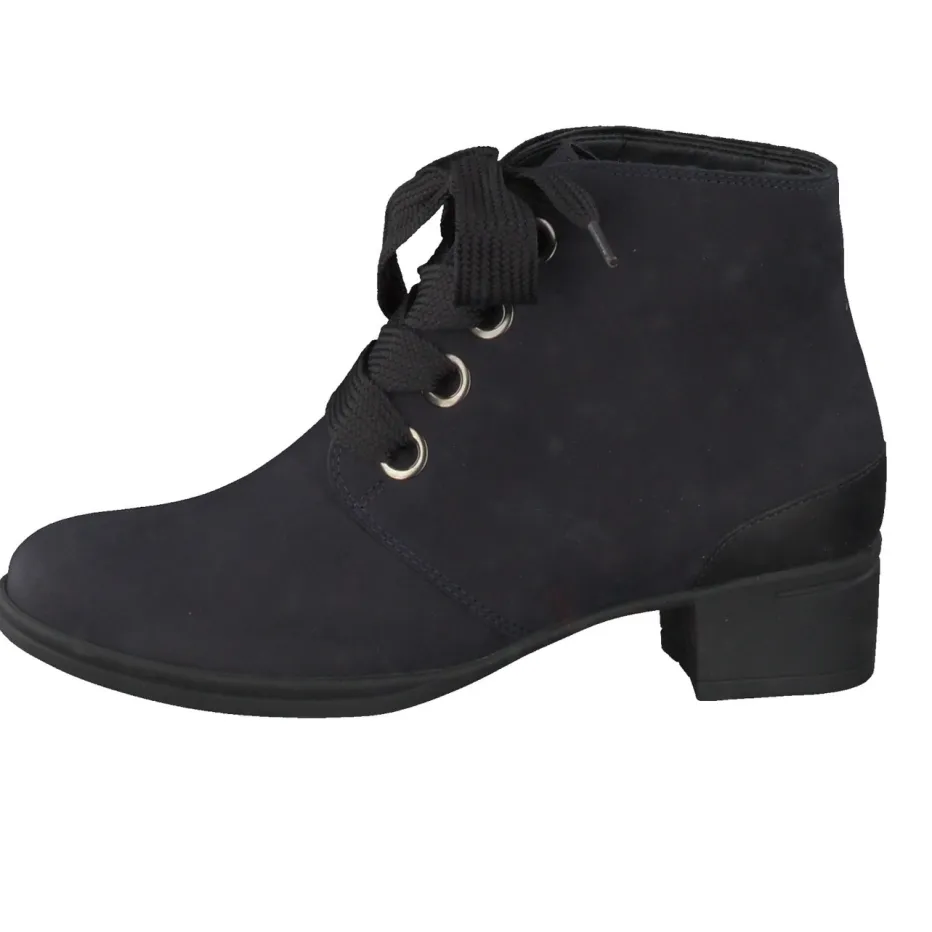 Stil und Komfort im urbanen Alltag.Hartjes präsentiert diese klassische Damen-Stiefelette mit bequemer Schnürung und dezentem Blockabsatz. Ob für den Weg ins Büro oder beim Stadtbummel – das weich verarbeitete Nubukleder mit samtigem Finish sorgt für angenehmen Tragekomfort. Die dunkelblaue Farbgebung wird durch einen schwarzen Fersenakzent stilvoll ergänzt, während die breiten Schnürsenkel und Metallösen in Silberoptik optische Akzente setzen. Das warme Textilfutter und die gummierte Laufsohle bieten verlässliche Funktion an kühlen Tagen, die herausnehmbare Einlage unterstützt individuellen Komfort. Der Look folgt dem Trend „Quiet Luxury“ in alltagstauglicher Umsetzung. Ein durchdachtes Design für stilbewusste Vielseitigkeit im Herbst und Winter.