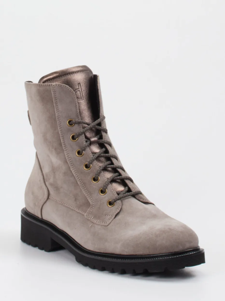 Herbstlicher Allrounder in Design und Funktion.Durea präsentiert eine moderne Damen-Schnürstiefelette, inspiriert von Workwear und urbaner Zurückhaltung. Taupefarbenes Veloursleder mit matt-samtiger Oberfläche verleiht dieser klassisch-schmalen Combat Boot Silhouette eine dezente Eleganz. Goldfarbene Ösen und eine bronzefarbene Metallic-Zunge setzen edle Akzente. Reißverschluss und Schnürung erleichtern das Anziehen, während die griffig profilierte Gummisohle mit 2 cm Absatz sicheren Halt bietet. Der 15 cm hohe Schaft umschließt den Knöchel angenehm. Passend zum Trend „Modern Utility“ lässt sich dieses Modell besonders gut mit monochromen Outdoor-Outfits kombinieren. Komfort trifft auf zeitloses Design – typisch Durea.