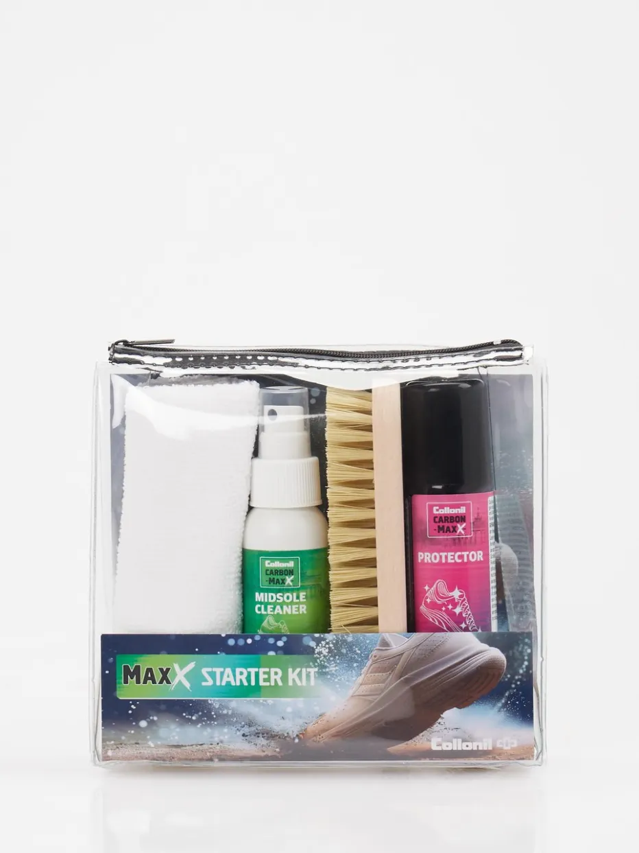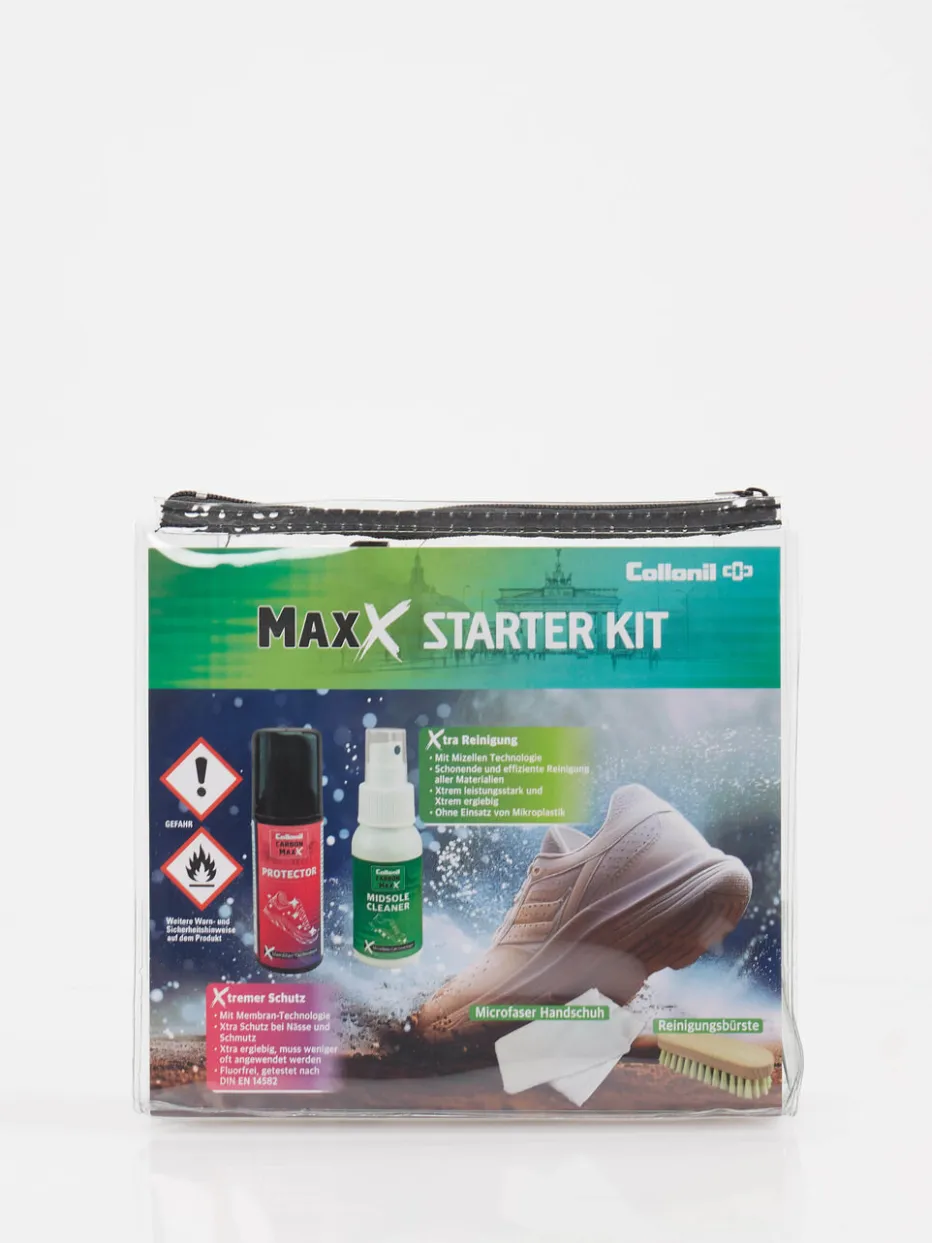 Sneakerpflege für unterwegs! Collonil präsentiert mit dem MaxX Starterkit ein kompakt gestaltetes Schuhpflege-Set. Für die schnelle Reinigung und Pflege im Alltag oder auf Reisen bietet das Set eine Kombination aus Midsole Cleaner, Protector-Spray, Bürste mit Holzgriff und Mikrofasertuch. Die Pflegeprodukte werden übersichtlich in einem rechteckigen Reißverschlussbeutel aus Synthetikmaterial verstaut. Das All-in-One-Reinigungskit steht für unkomplizierte Pflege mit markentypischem Know-how.