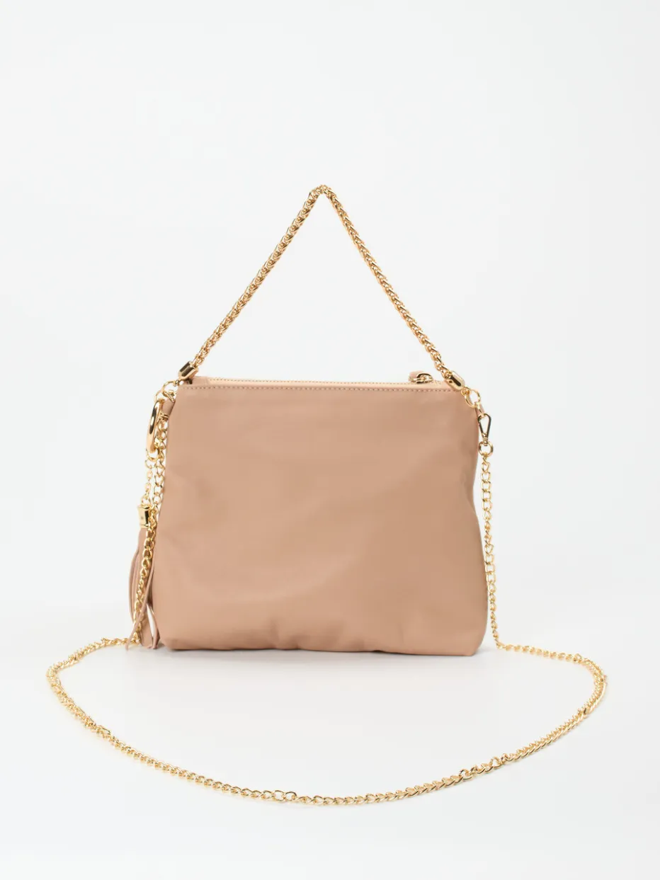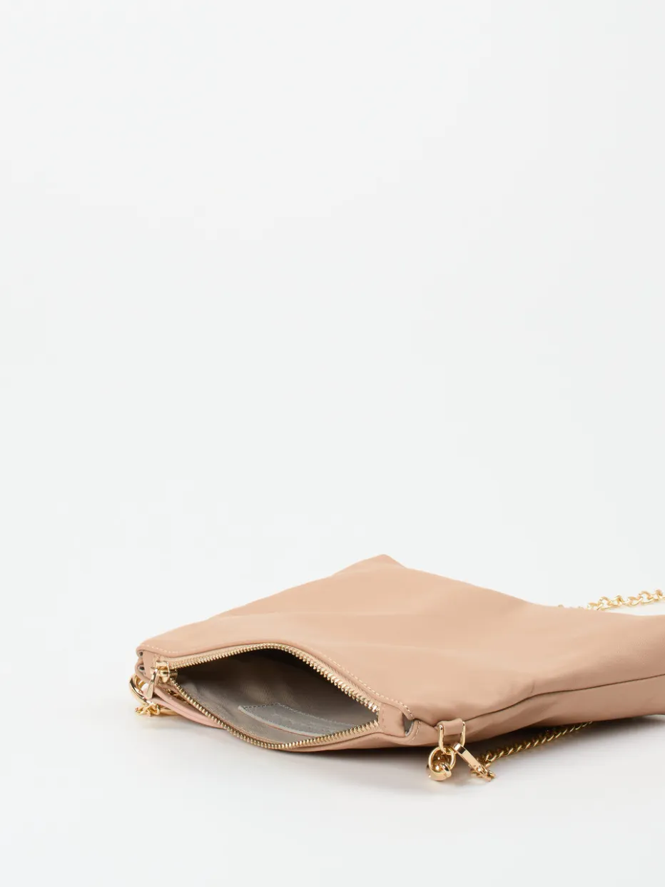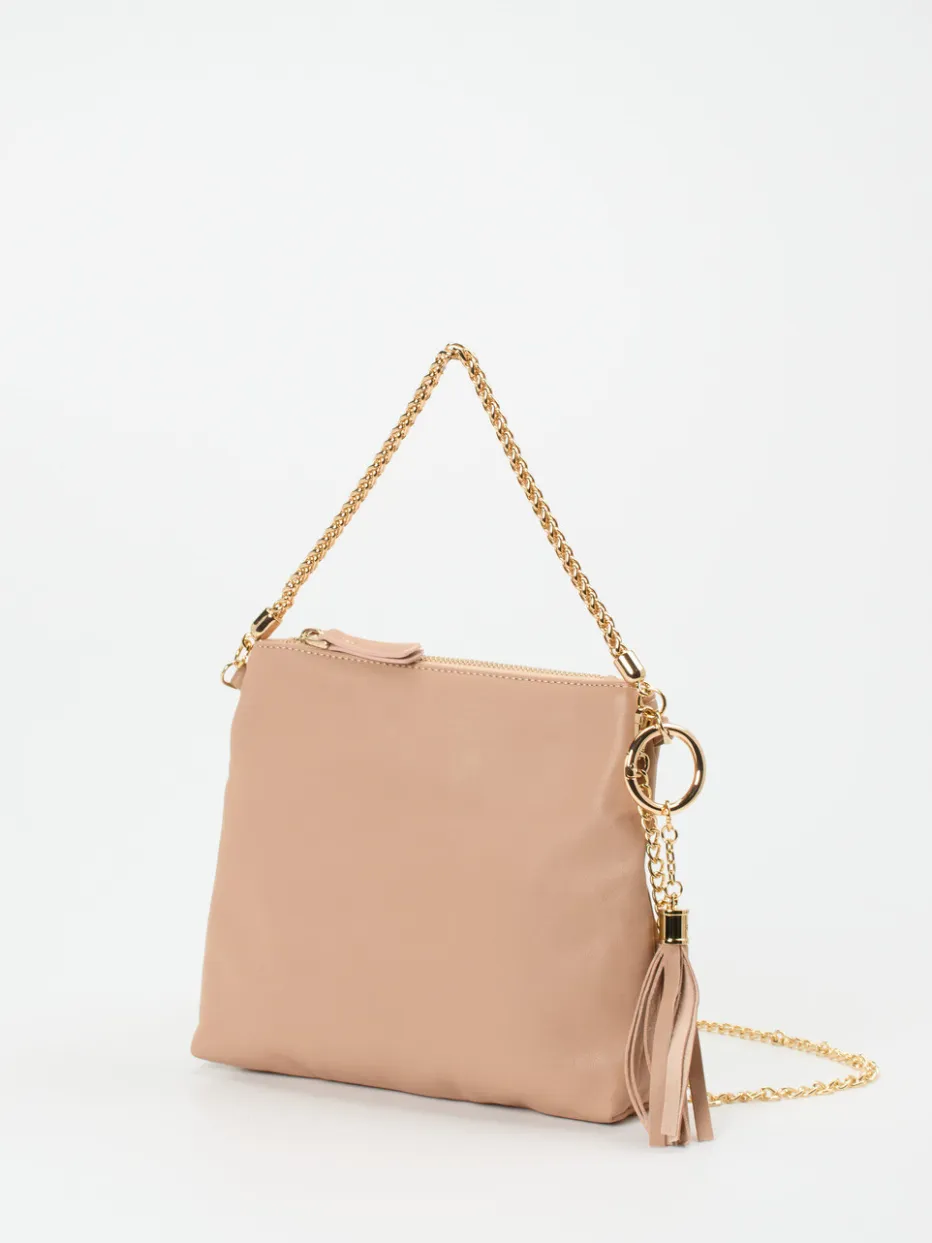 Die Kombination aus softem Lammleder, goldfarbenem Kettenriemen und puristischer Silhouette setzt dezente Luxusakzente mit hohem Stilbewusstsein.