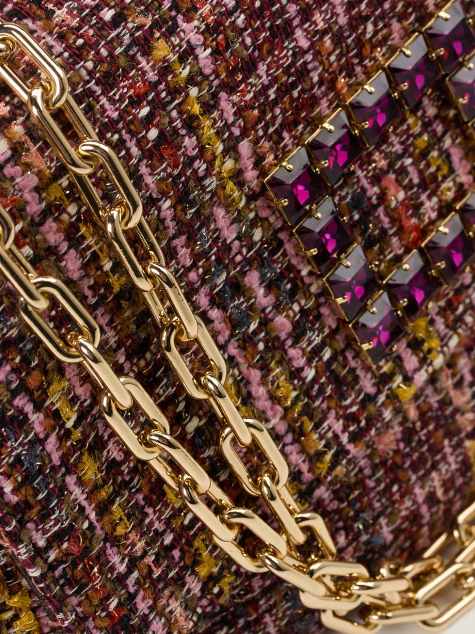 Diese raffinierte Chain Bag kombiniert strukturreichen Bouclé-Stoff mit eleganter Strassverzierung. Ideal für einen stilvollen Auftritt zwischen Vintage-Flair und modernem Quiet-Luxury-Trend.