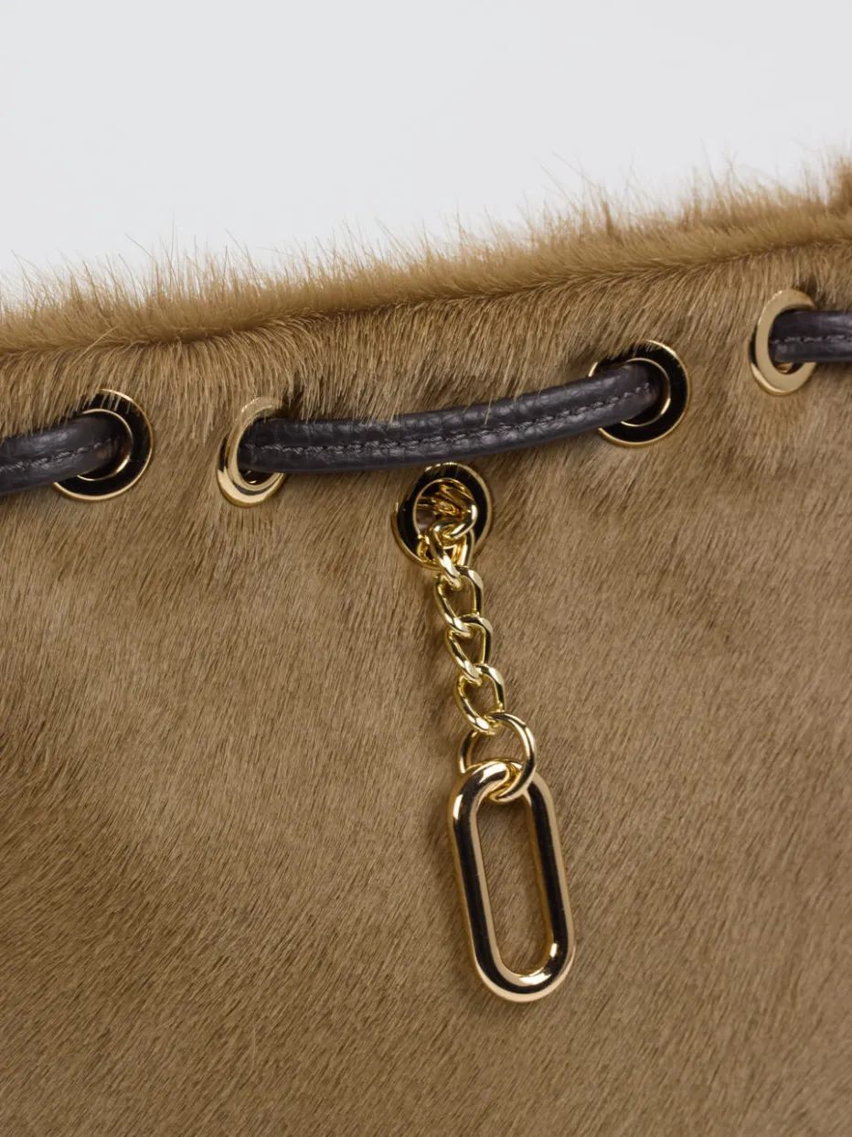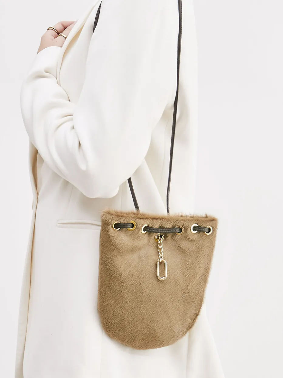 Dank flauschiger Oberfläche im Kunstfell-Look und goldfarbenem Kettendetail vereint diese Bucket Bag mühelos Trendgefühl und klare Formensprache.
