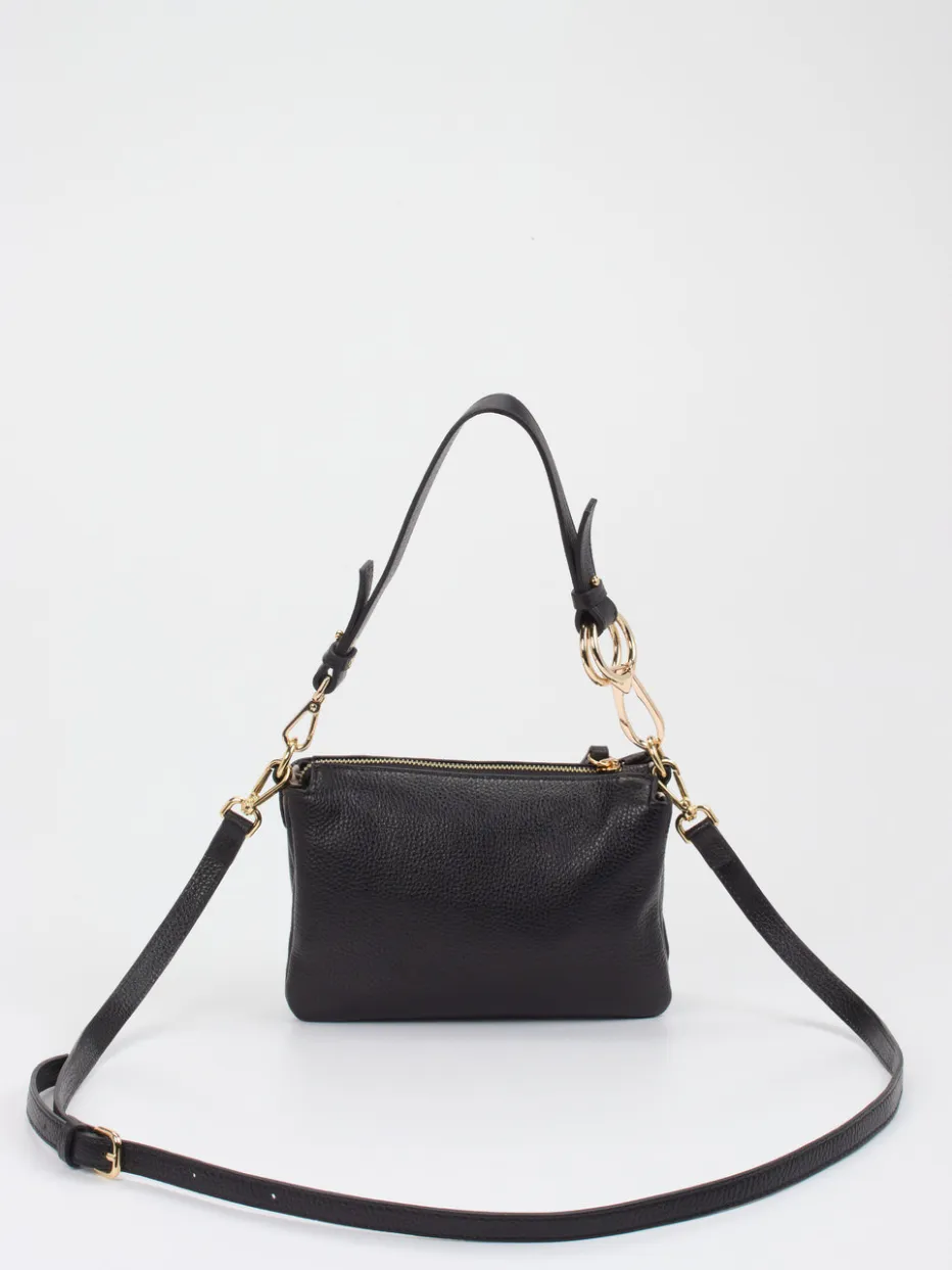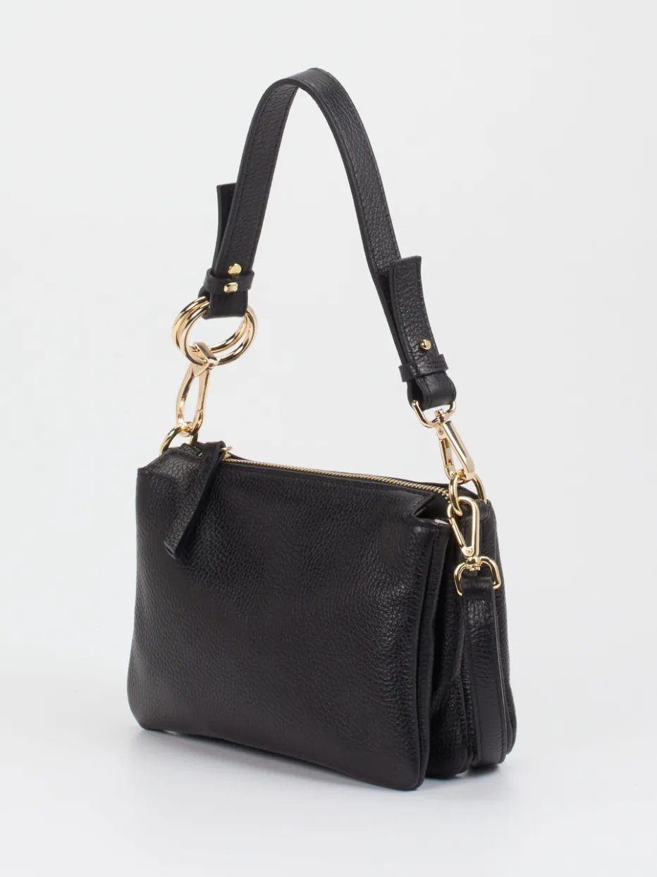 Die schwarze Schultertasche von Konstantin Starke vereint fein genarbtes Kalbleder mit goldfarbenen Details – ein minimalistisches Designstück für stilvolle Alltagseleganz.