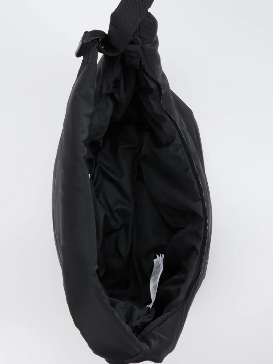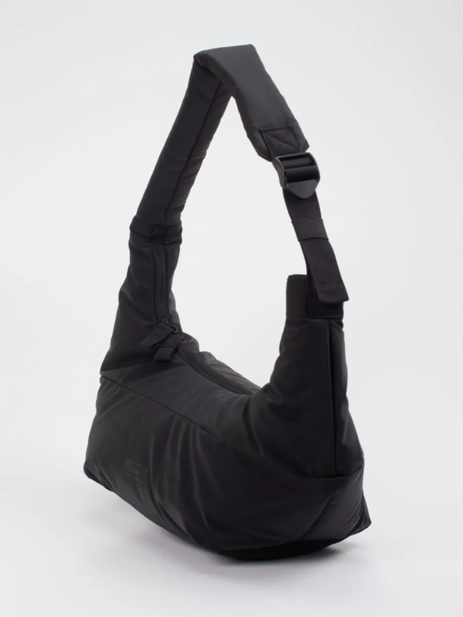 Die gepolsterte Hobo Bag aus mattem Synthetikmaterial verbindet urbanen Komfort mit minimalistischer Funktionalität – ideal für einen reduzierten Alltagslook.