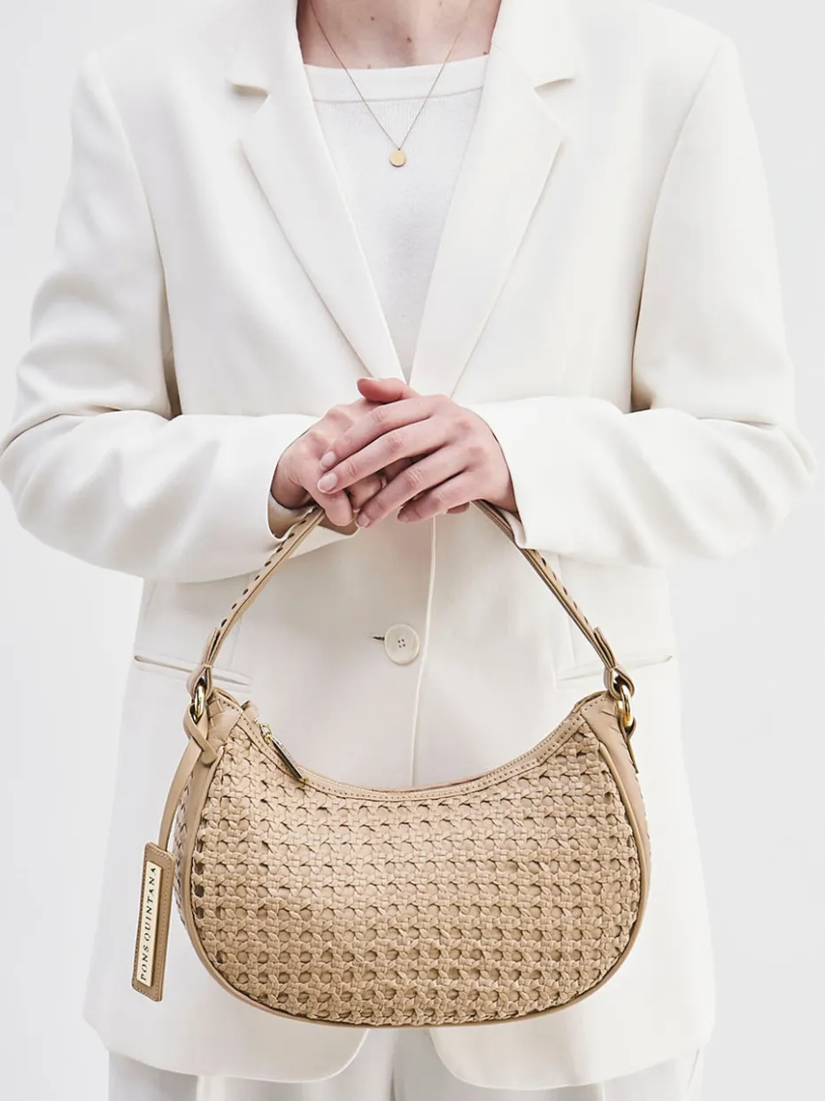 Die halbmondförmige Schultertasche besticht durch eine elegante Flechtstruktur, goldfarbene Akzente und klaren Minimalismus – ideal für moderne Sommerlooks.