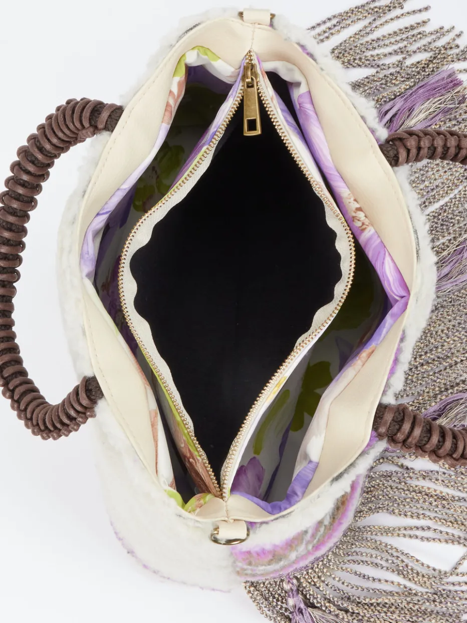 Ein echter Blickfänger ist diese kreative Tasche aus dem Hause Konstantin Starke. Das Teddyfell begeistert durch seinen unkonventionellen Farbmix in Offwhite, Violett und Braun. Die Kordeln am unteren Taschenbereich lassen ein Hauch von Boheme aufleben. Die gehäkelten, schokoladenbraunen Henkel werden von tonigem Flechtleder umwickelt. Das Innere wird durch ein farbenfrohes Blütenmuster belebt. Es enthält ausreichend Platz für all Ihre Essentials. Der bestickte Schulterriemen kann bei Bedarf abgenommen werden. Ein tolles Accessoire, das in Erinnerung bleibt! – Material: Textil – Farbe: Multi – Maße: ca. 25 x 38 x 13 ( H x B x T) – Innen: zwei Reißverschlussfächer – Schulterriemen: ca. 90 cm, abnehmbar, verstellbar