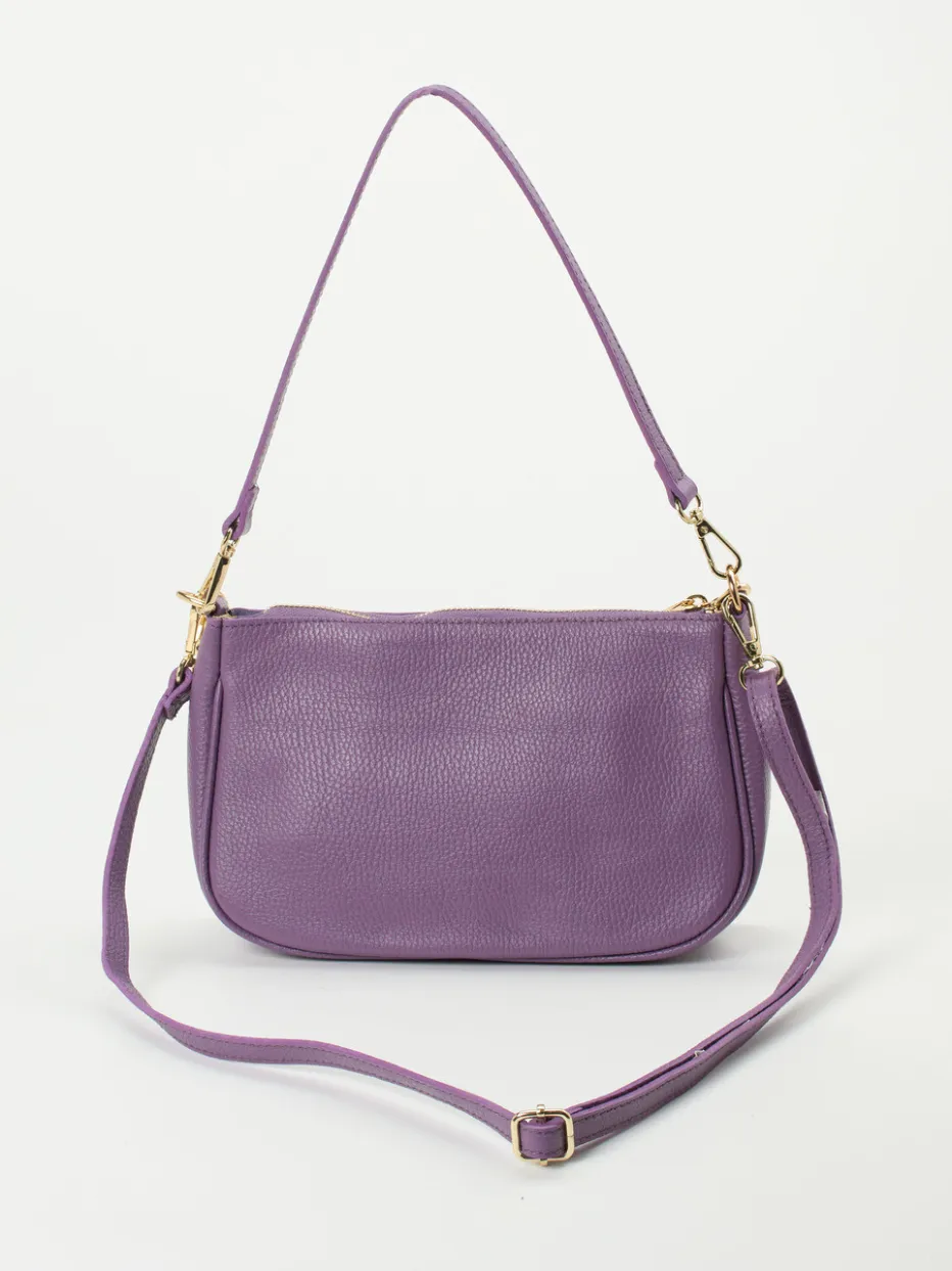 Feingenarbtes Kalbleder in zartem Flieder trifft auf goldene Kettendetails und klare Formgebung. Eine Baguette Bag mit Stil und Trendsicherheit.