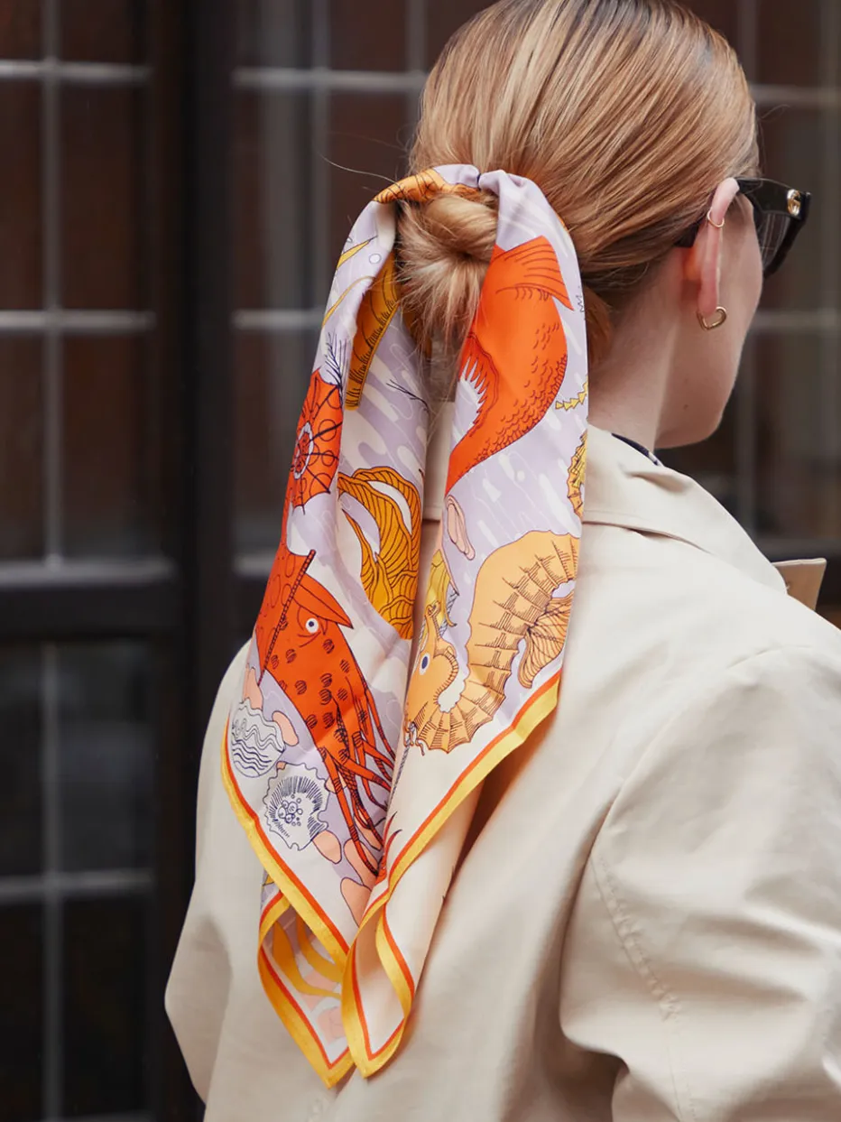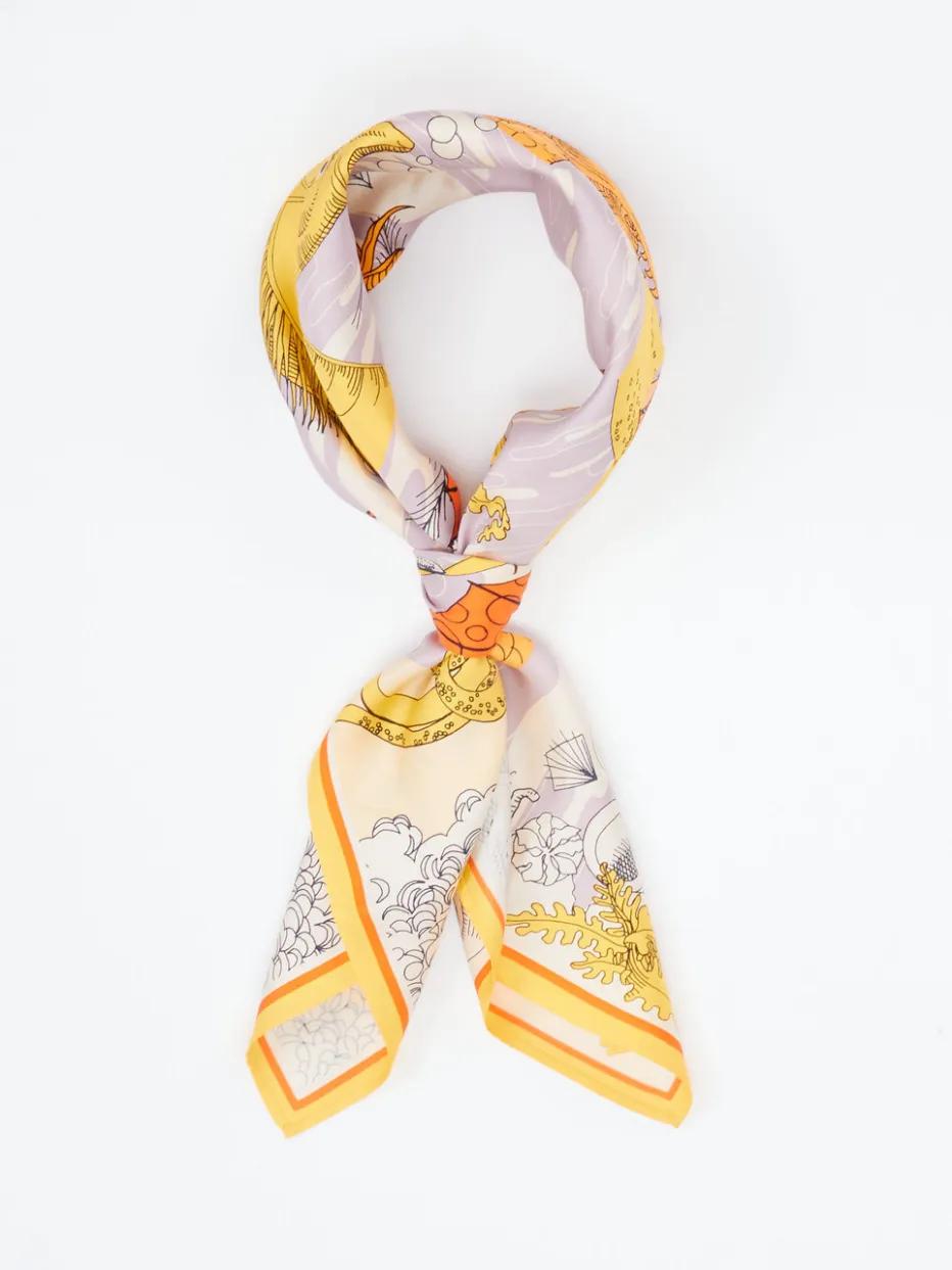 Ein quadratisches Tuch aus reiner Seide mit maritimem Print in sanften Blasslila-, Orange- und Gelbtönen – feminin, leicht und raffiniert kombinierbar.