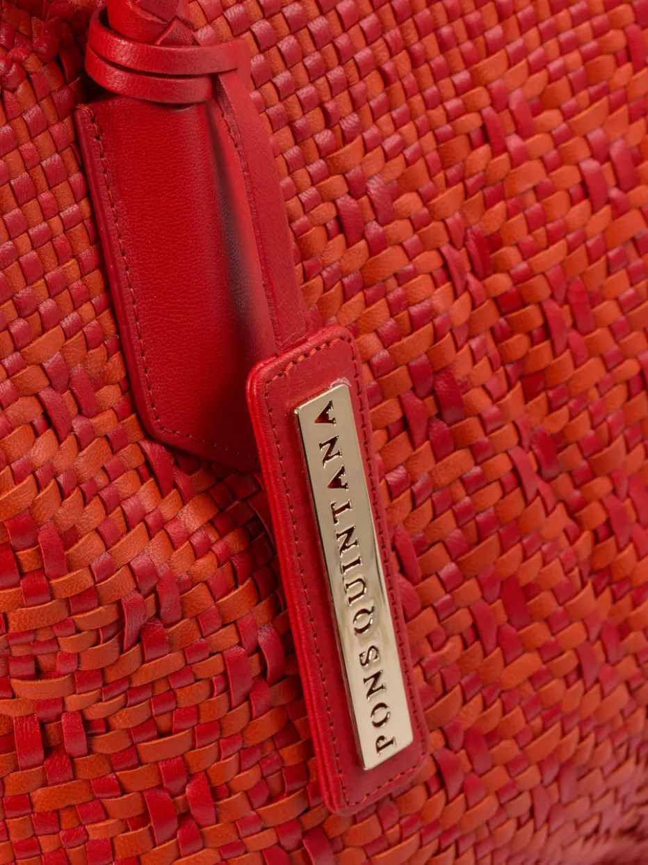 Dieser in Tomatenrot gefärbte Flechtleder-Shopper verbindet mediterranen Charme mit funktionaler Raffinesse – ein markanter Begleiter für stilbewusste Tageslooks.