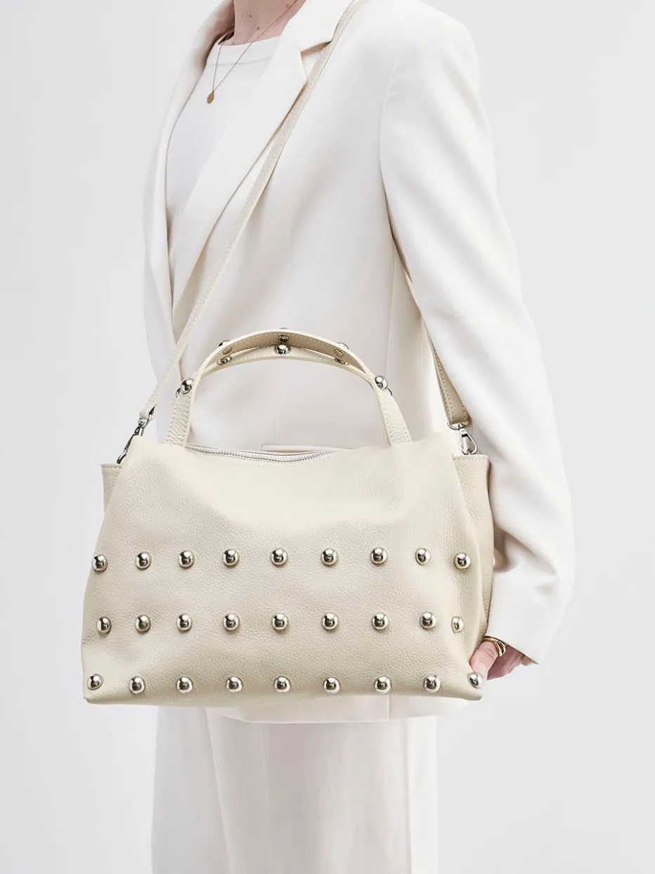 Ein echter Hingucker ist diese modische Umhängetasche des italienischen Labels Marlon Firenze. Das beige Kalbleder bekommt durch die natürliche Narbung eine feine Struktur. Große silberfarbene Nieten sehen toll aus und verleihen ein urbanes Lebensgefühl. Der geräumige Innenraum bietet viel Platz. Der tonige Schulterriemen kann auf Wunsch abgenommen werden. Ein selbstbewusstes Accessoire, das Ihrem Outfit einen raffinierten Touch verleiht! – Material: Kalbleder – Farbe: Beige – Größe: 26 x 36 x 22 cm (H x B x T) – Schulterriemen: ca. 115 cm, abnehm- und verstellbar – Verschluss: Reißverschluss – Innen: ein Reißverschlussfach
