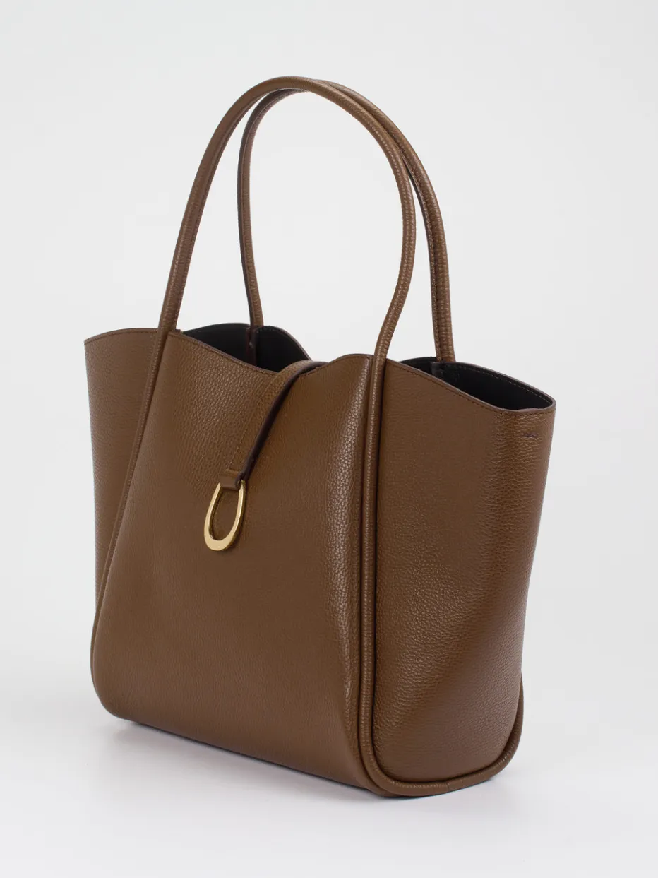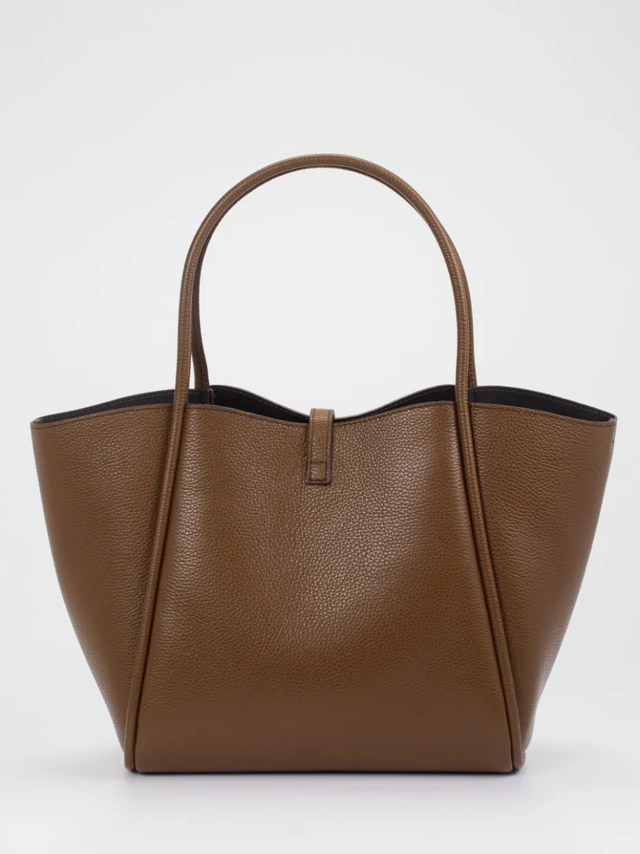 Stilvoll organisiert durch Alltag und Business: der elegante Shopper von Konstantin Starke verbindet klassische Linien mit modernen Akzenten. In mittelbraunem Kalbleder mit genarbter Struktur und goldfarbener Hardware gestaltet, bietet die trapezförmige Tote Bag eine gelungene Kombination aus Form und Funktion. Das großzügig bemessene Hauptfach ist durch einen Reißverschluss sicher verschließbar, innen sorgt ein separates Fach für Ordnung. Doppelhenkel ermöglichen bequemes Tragen, das schwarze Textilfutter rundet das hochwertige Gesamtbild ab. Als modisches Statement im Quiet-Luxury-Stil passt sie ideal zu Trenchcoat und Loafern. Ein stilvoller Begleiter für anspruchsvolle Tage mit klarer Ästhetik.
