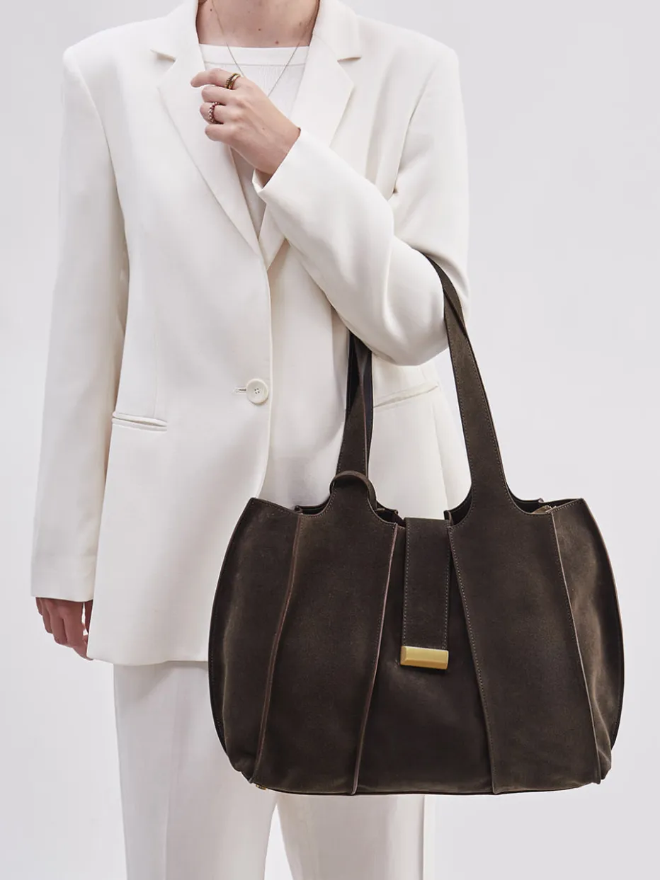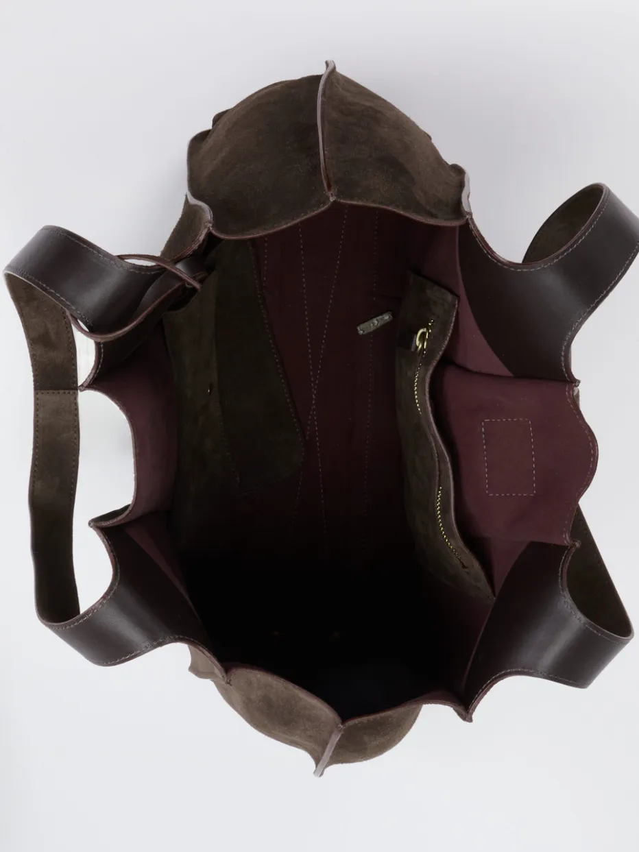 Hochwertiges Veloursleder trifft auf eine reduzierte Oversized-Form – diese Tasche verkörpert ein stilvolles Understatement mit funktionalen Details für Büro und Freizeit.