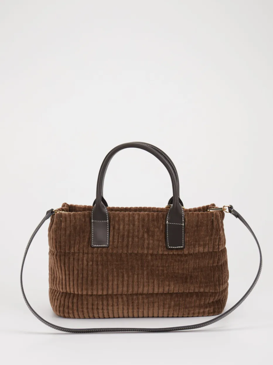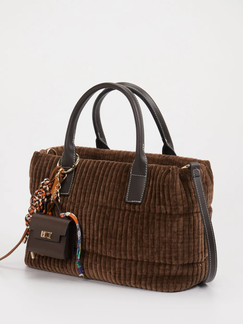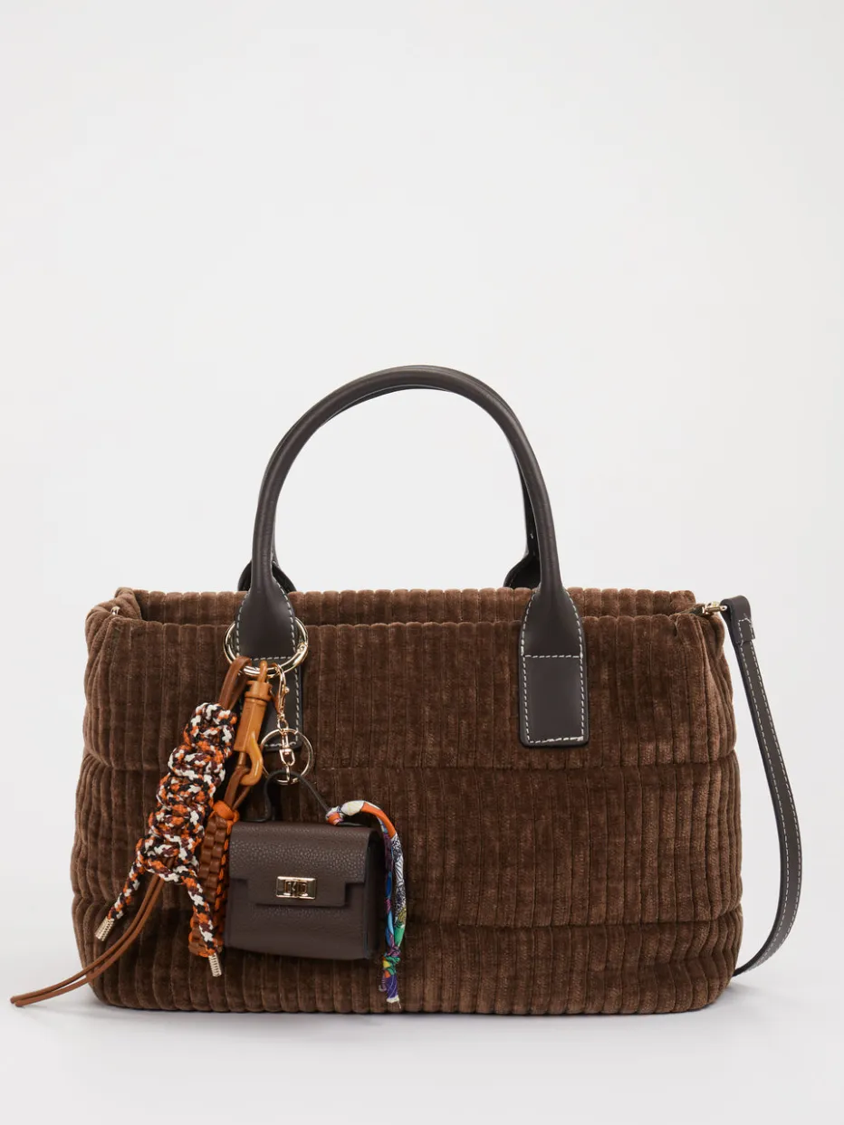 Strukturierter Cordstoff, warme Erdtöne und goldfarbene Akzente verleihen dieser Tasche lässige Boho-Eleganz. Ein stilvoller Begleiter für entspannte Herbsttage.